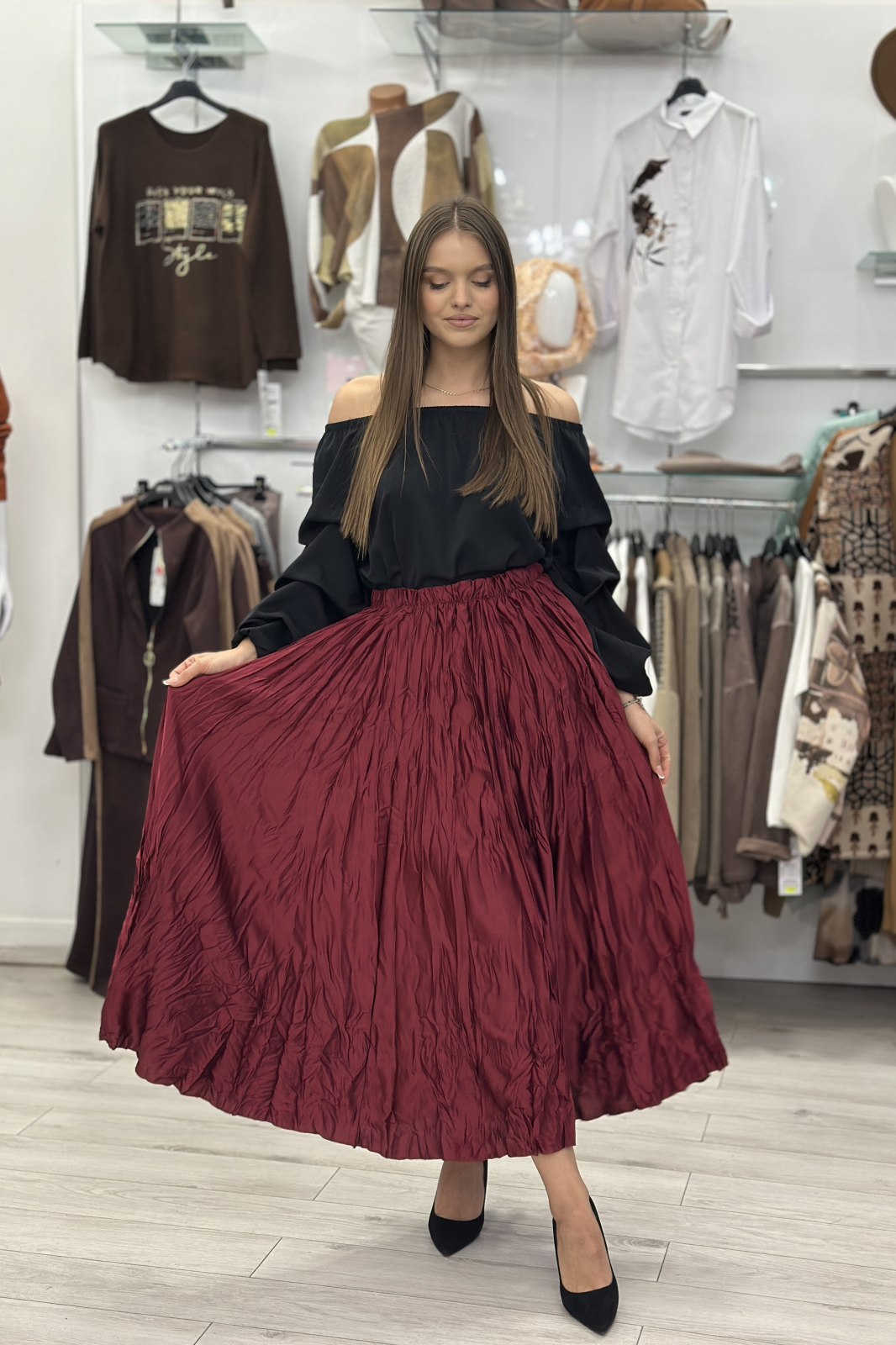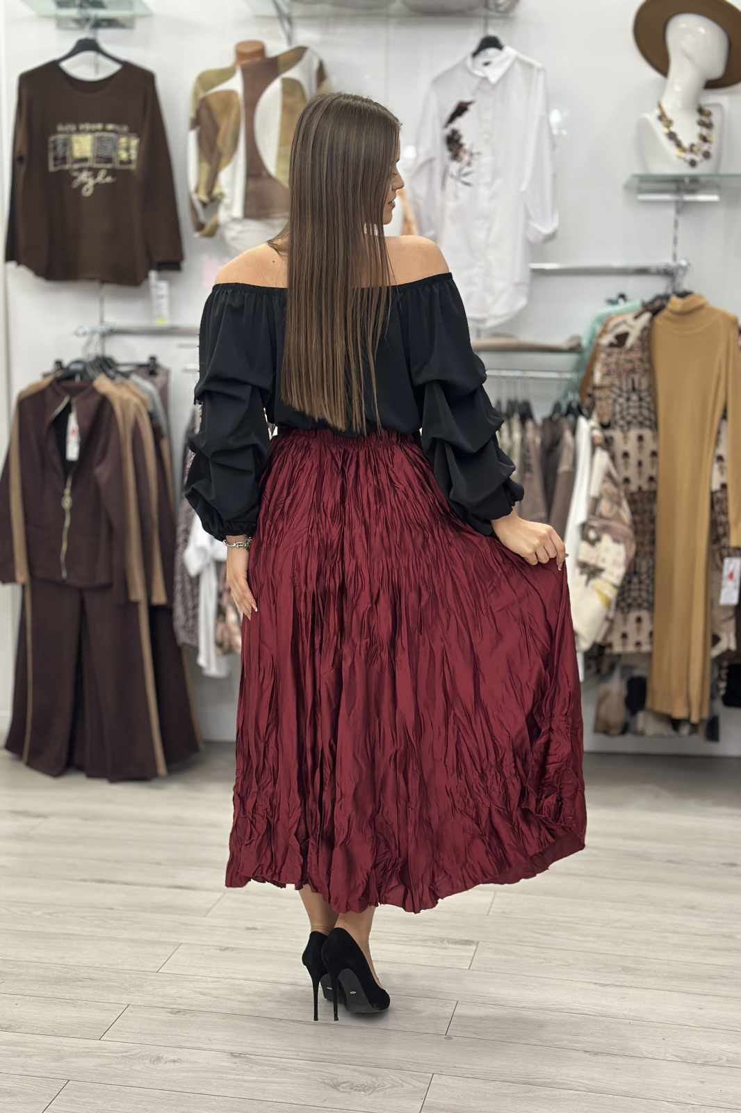 Când vrei să adaugi o notă de eleganță sofisticată garderobei tale, fusta lungă bordo creponată devine alegerea ideală. Nuanța bordo este profundă și feminină, perfectă pentru sezonul rece, iar textura creponată oferă un joc subtil de umbre care se plimbă cu tine la fiecare pas.
