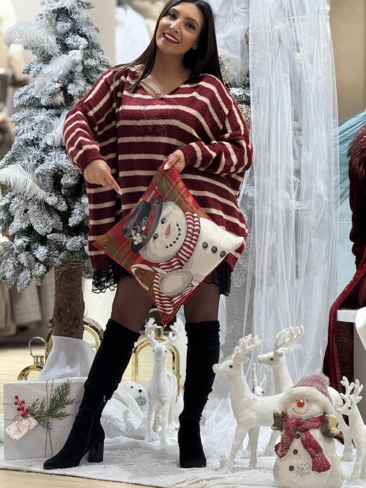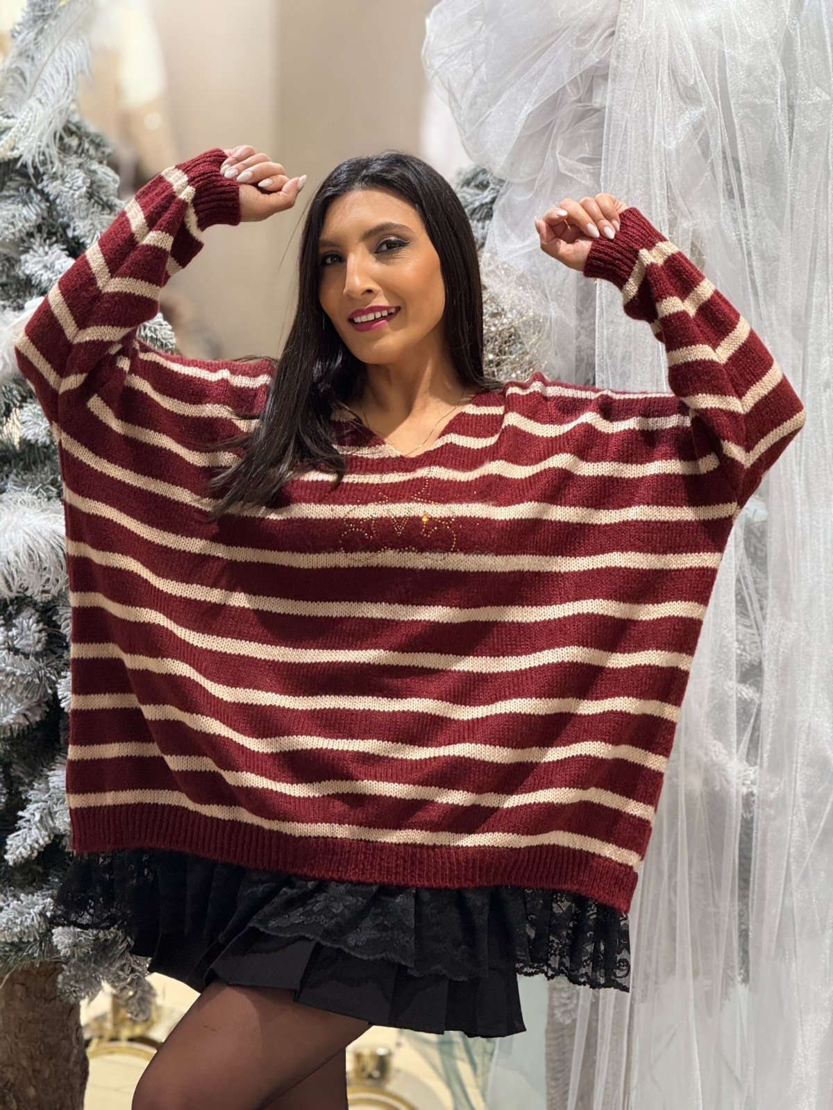 Bluza dama bordo tricotata cu dungi bej, anchior si ursulet din pietricele
