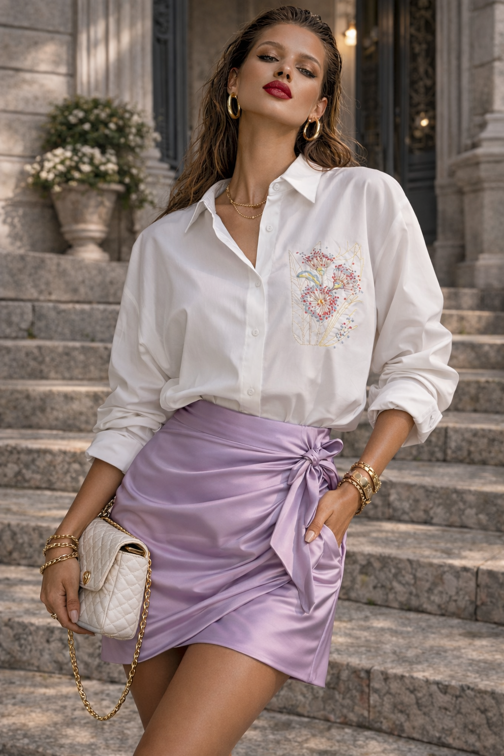 Jacheta dama scurta alba cu broderie si cordon in talie