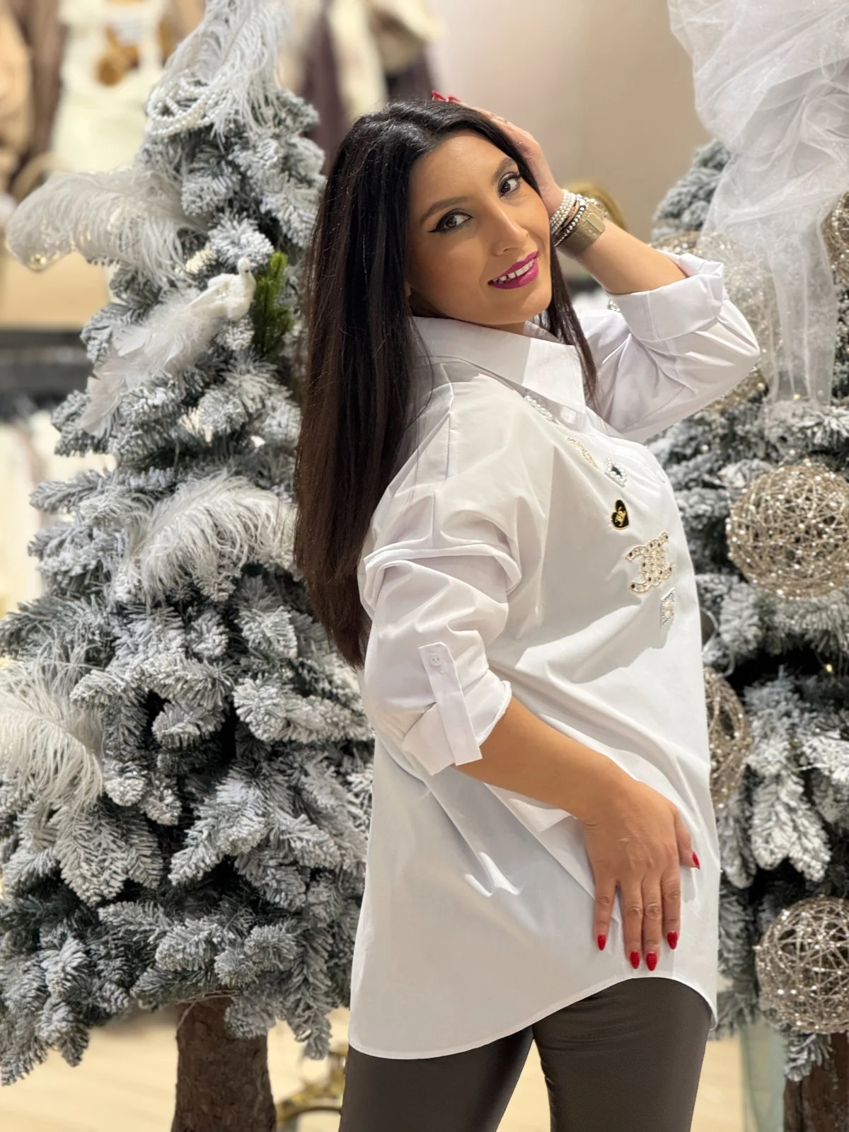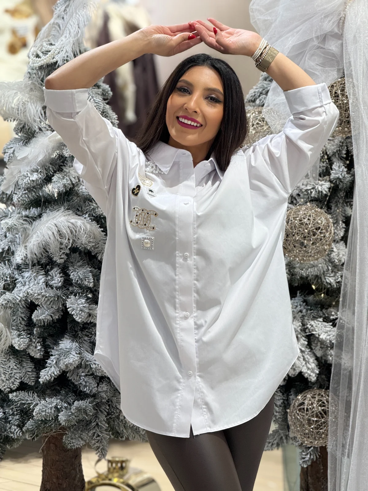 Cămașă albă din bumbac cu logo și pietricele decorative