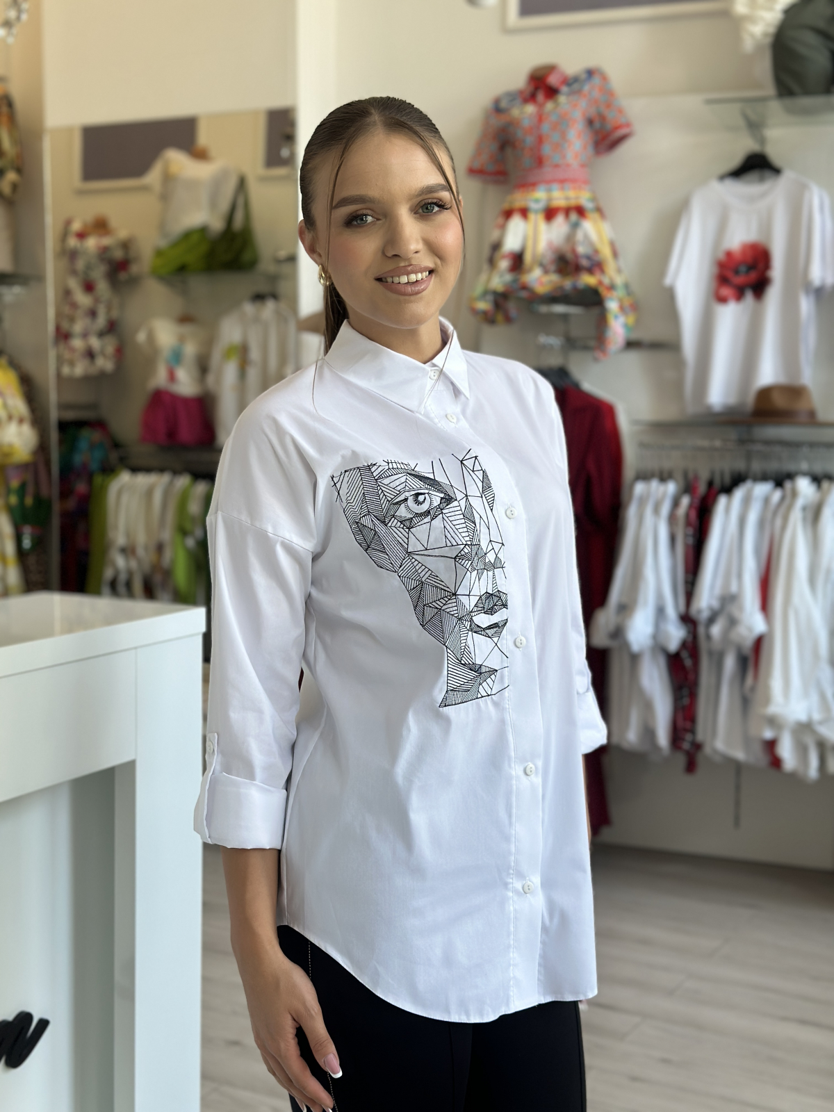 Descoperă partea ta artistică într-o piesă care exprimă personalitate și sensibilitate: cămășa damă albă din bumbac, cu croială universală și broderie în formă de față abstractă. Această pictură delicată, transpusă pe materialul finit, redă o eleganță contemporană, ideală pentru femeia care combină feminitatea cu creativitatea.