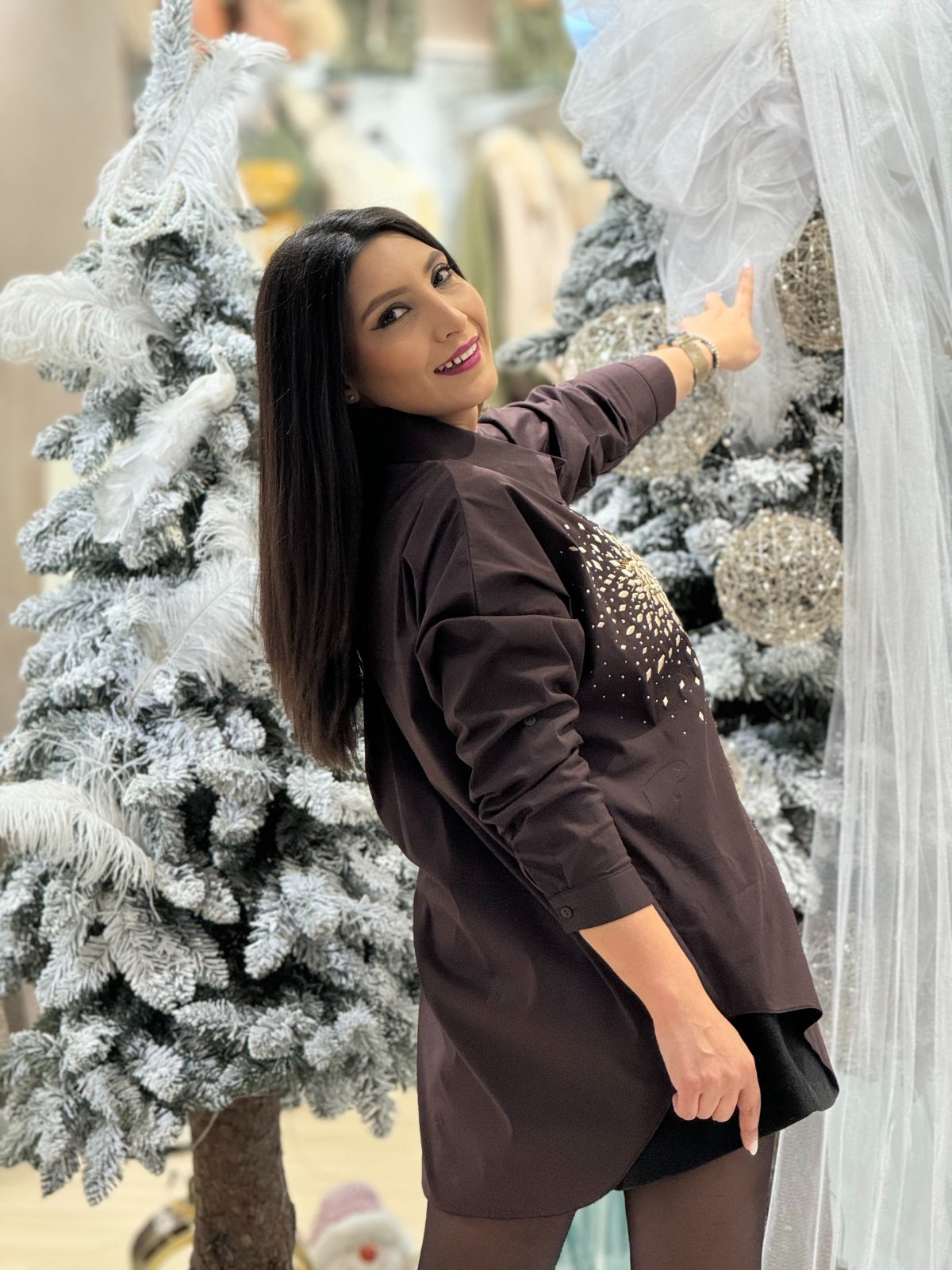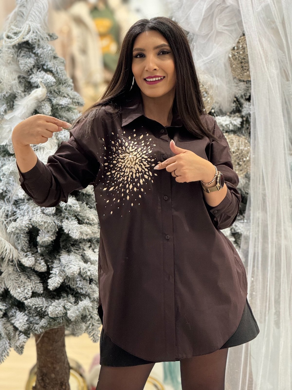 Această cămașă maro din bumbac îmbină naturalețea materialului cu eleganța broderiei crem și strălucirea discretă a pietricelelor. Fiecare detaliu adaugă profunzime și delicatețe, transformând o piesă simplă într-una cu personalitate.