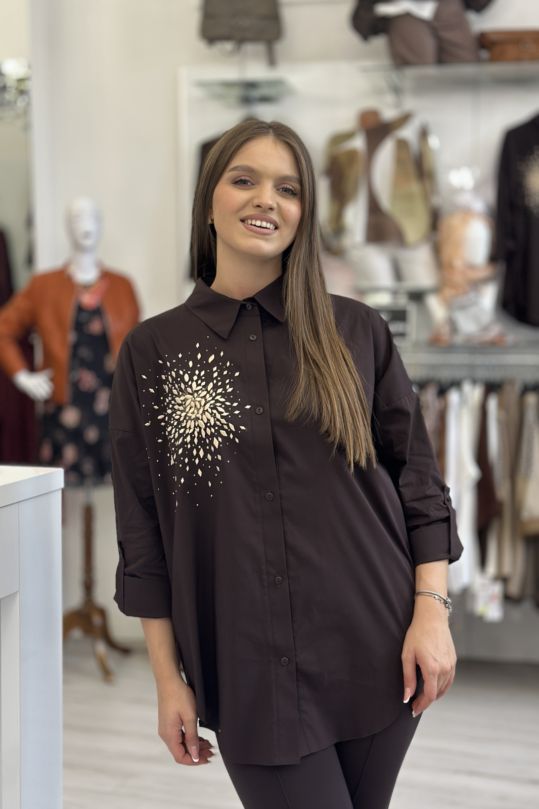 Această cămașă maro din bumbac îmbină naturalețea materialului cu eleganța broderiei crem și strălucirea discretă a pietricelelor. Fiecare detaliu adaugă profunzime și delicatețe, transformând o piesă simplă într-una cu personalitate.