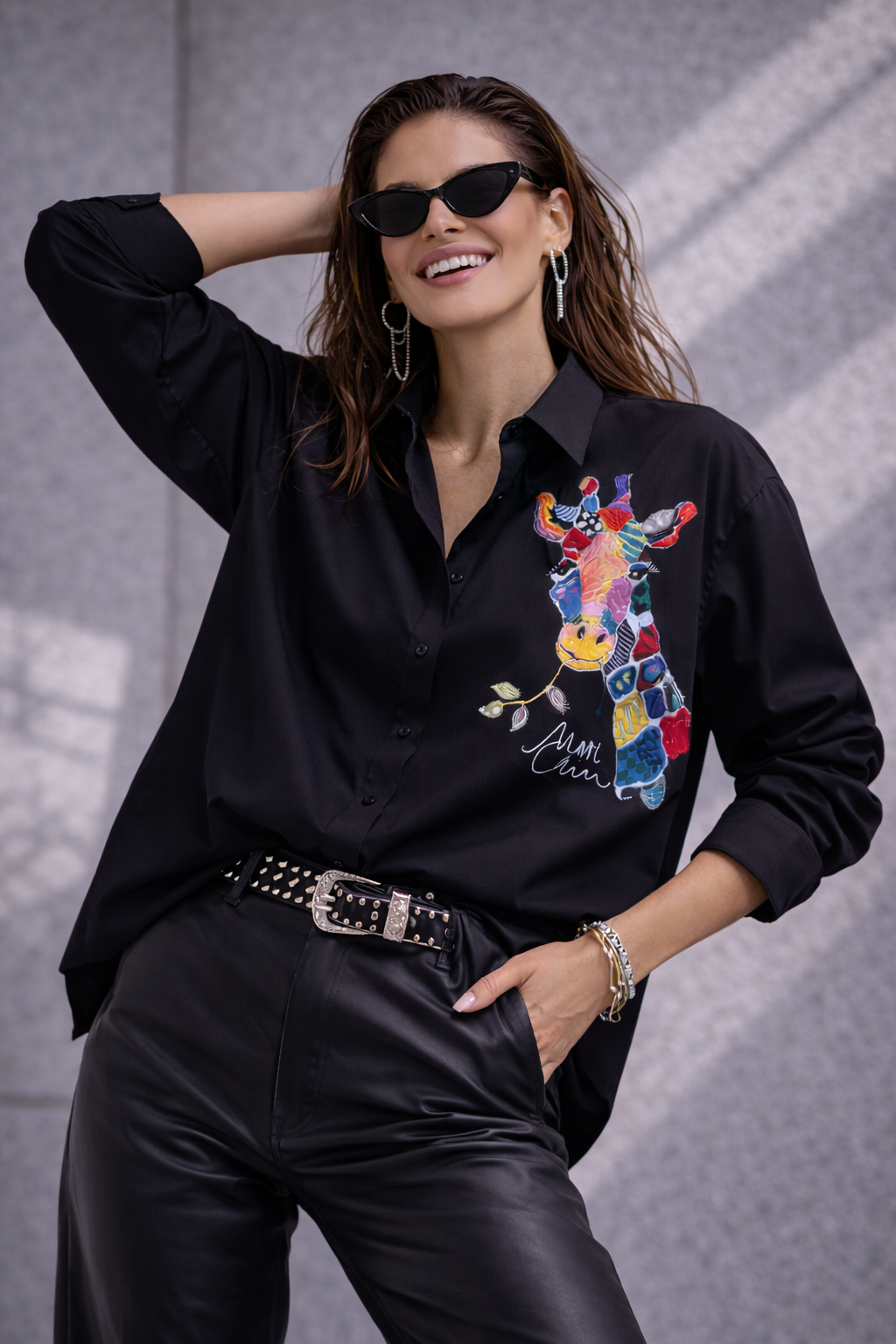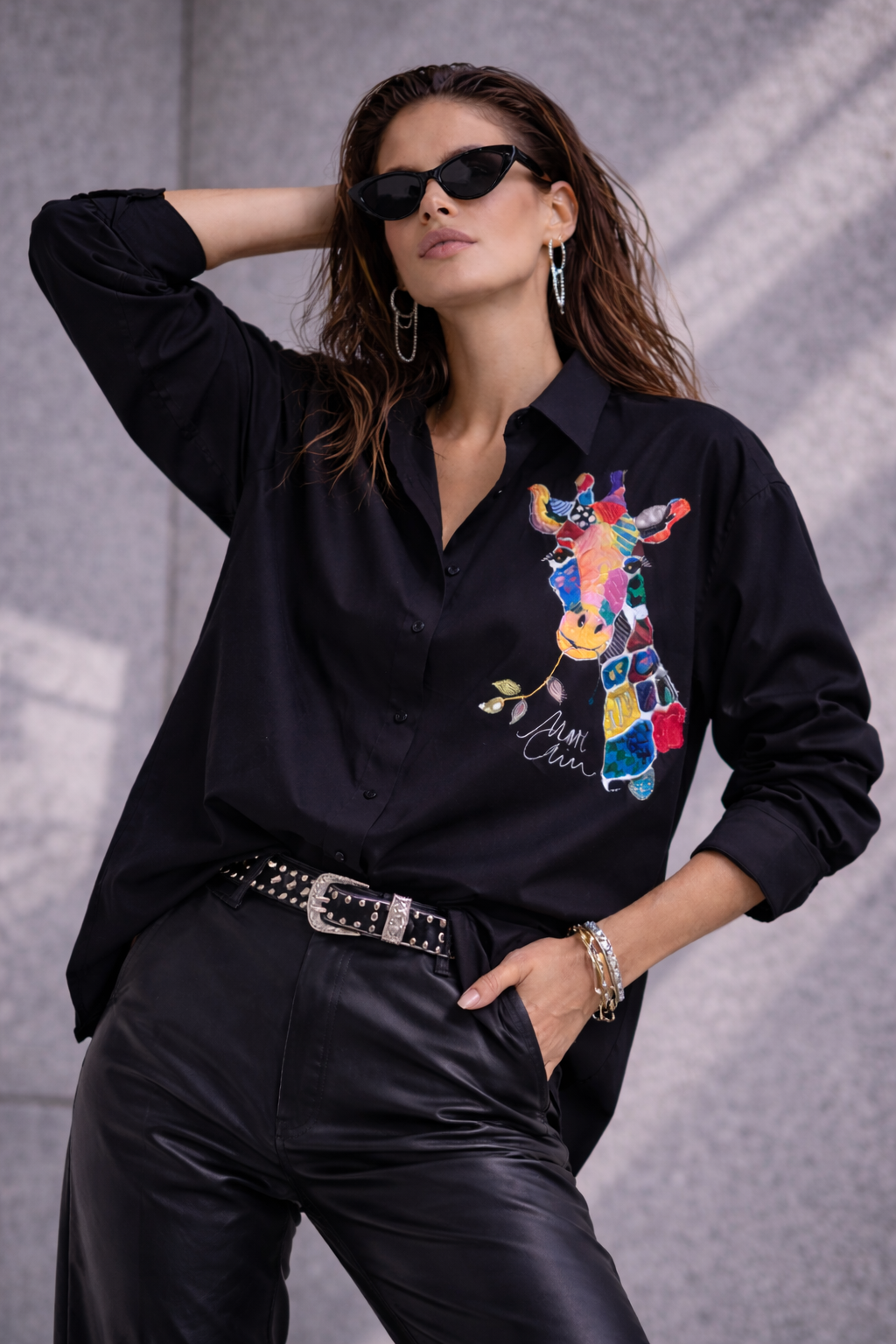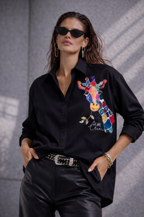 Camasa dama neagra din bumbac cu imprimeu girafa multicolora