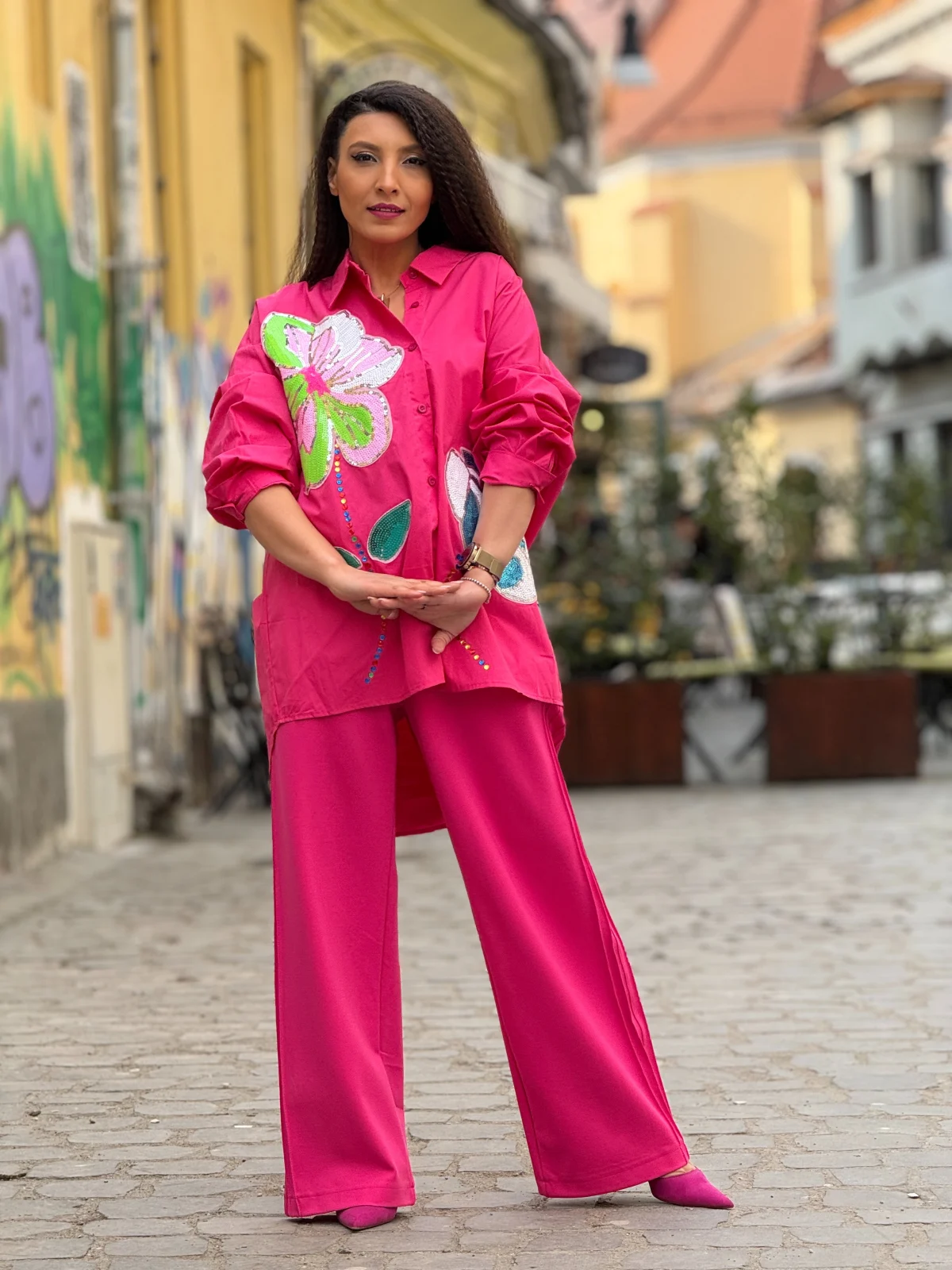 Camasa dama roz din bumbac cu imprimeu flori din paiete