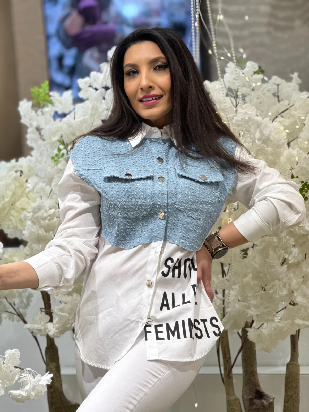 Jacheta dama alba cu insertii din denim si detalii metalice