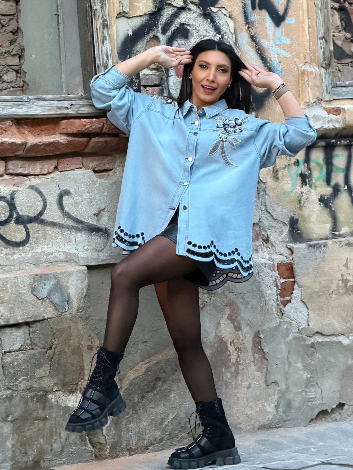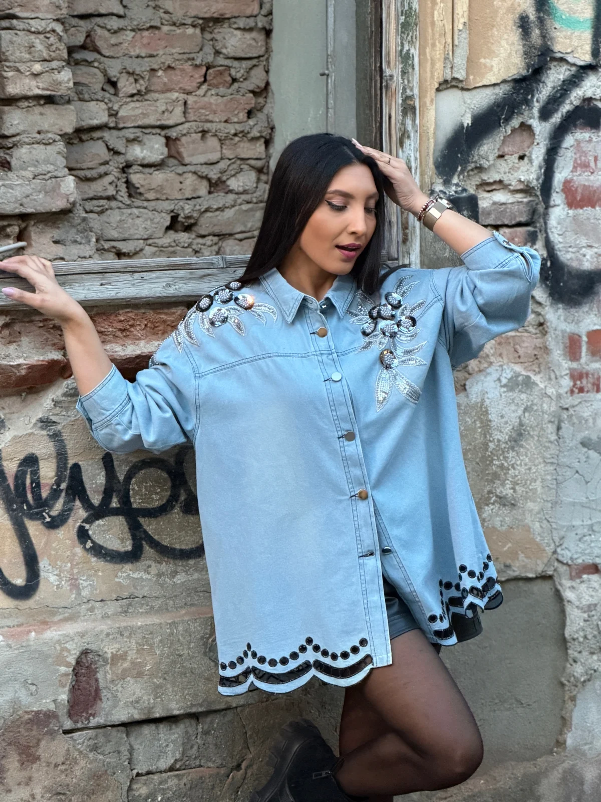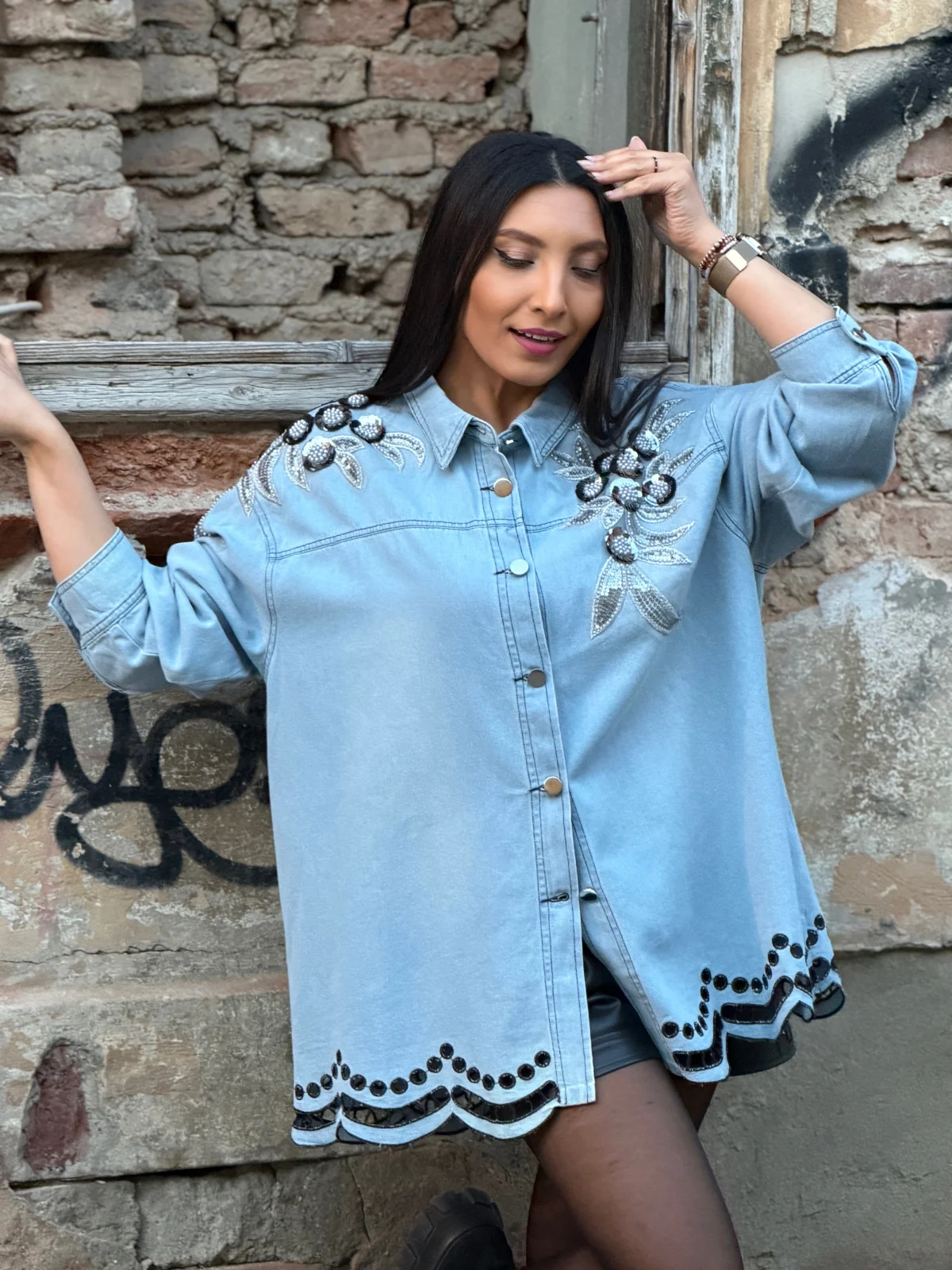 Camasa cu flori negre aplicate si broderie in partea de jos