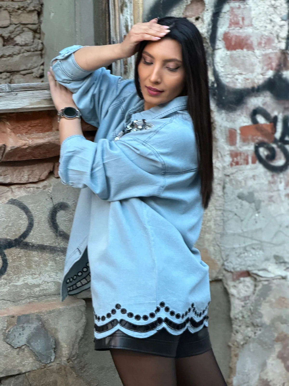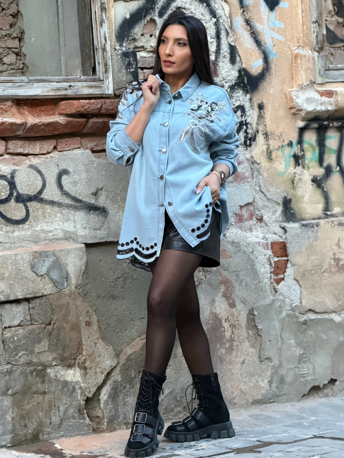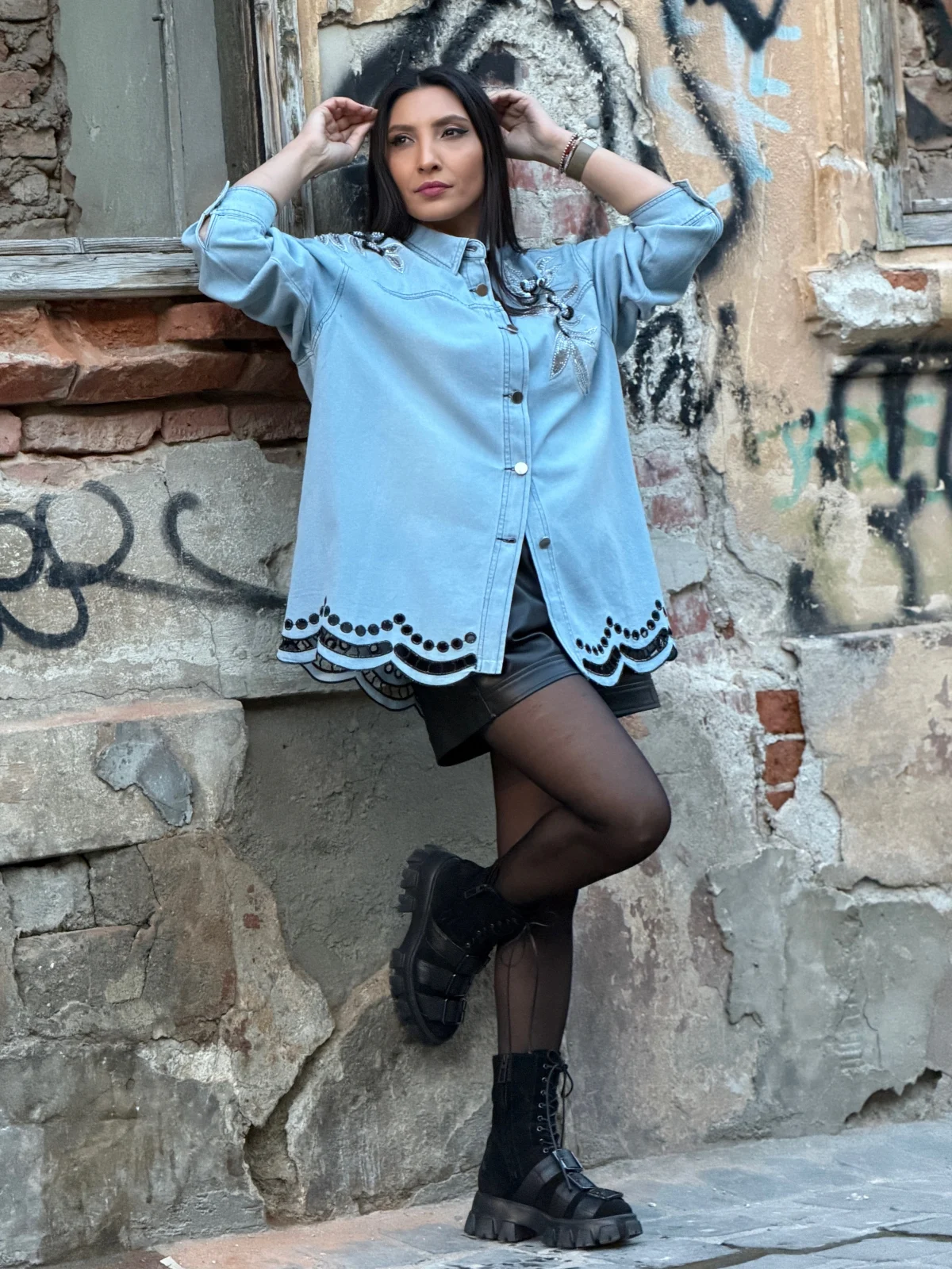 Camasa cu flori negre aplicate si broderie in partea de jos