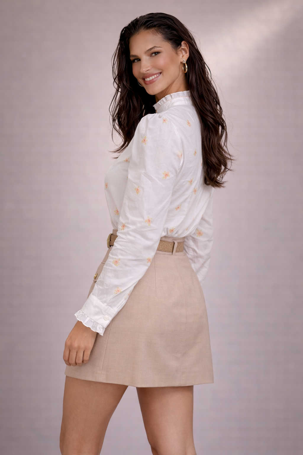 Jacheta dama scurta alba cu broderie si cordon in talie