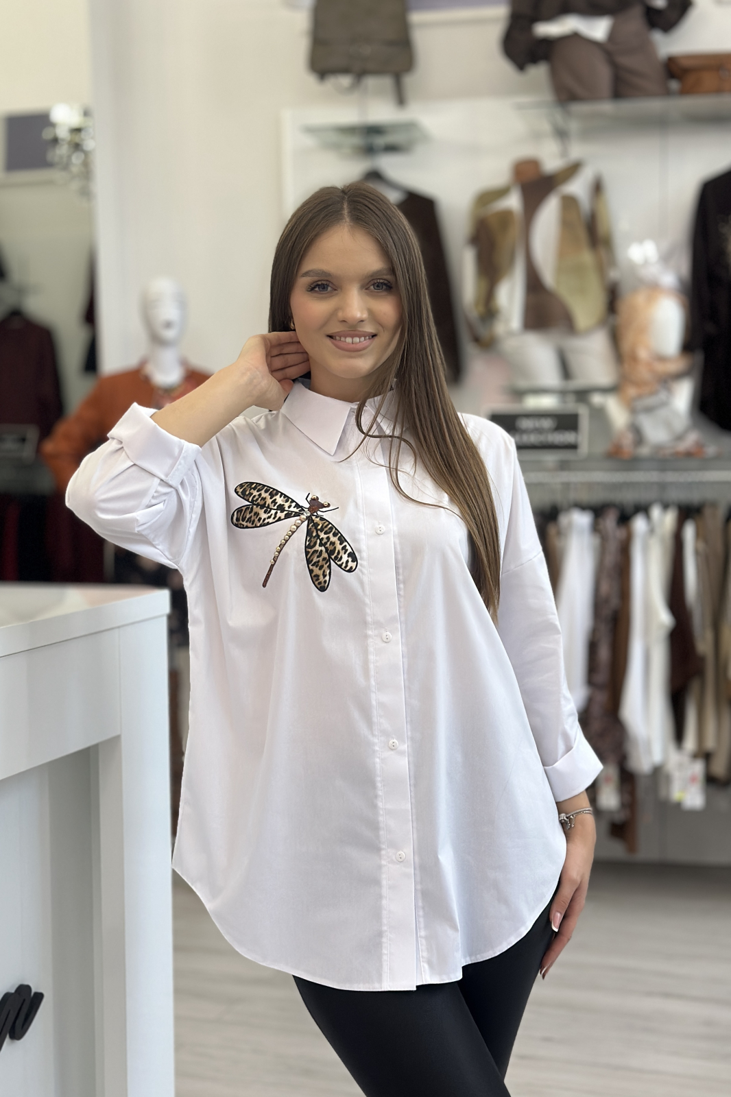 Această cămașă albă din bumbac impresionează prin simplitate și originalitate. Detaliul cu libelulă în animal print oferă o notă jucăușă și neobișnuită, care transformă o piesă clasică într-una cu personalitate. Este alegerea perfectă pentru femeia care vrea să păstreze eleganța, dar și să iasă din tipare.