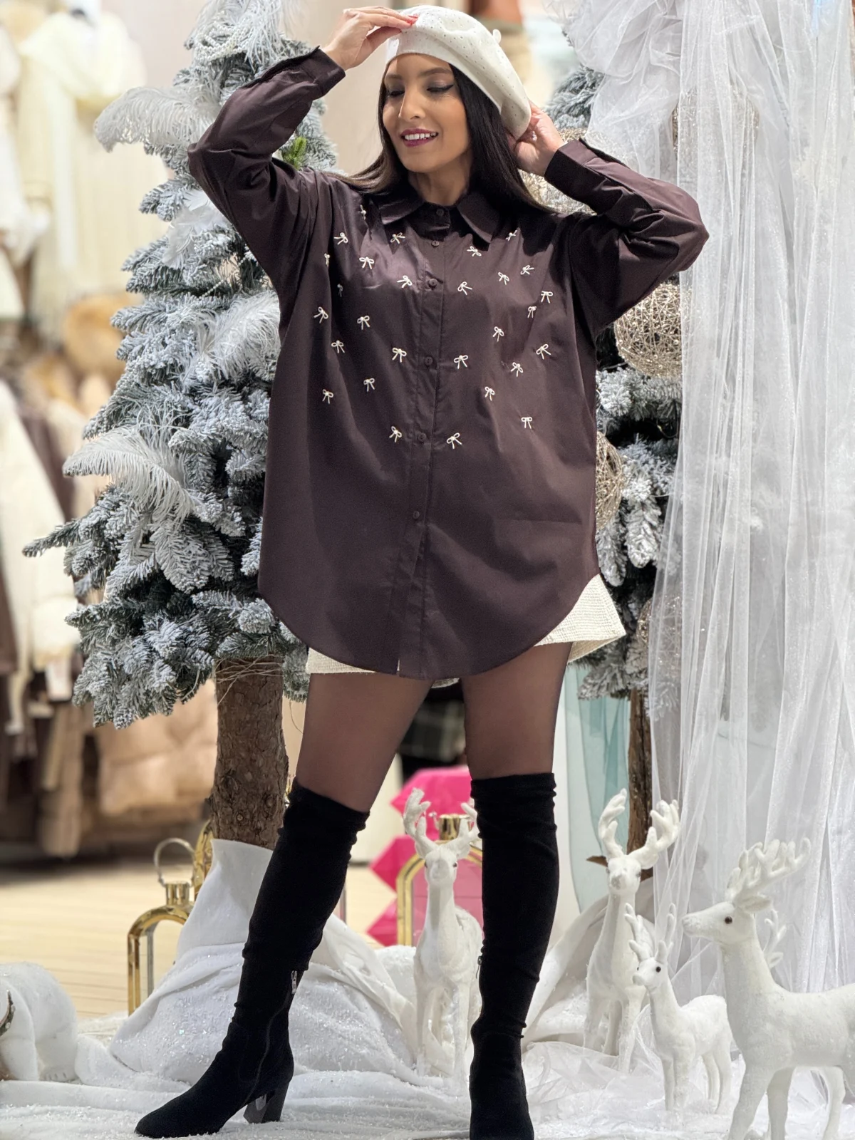 Camasa dama maro din bumbac cu fundite brodate
