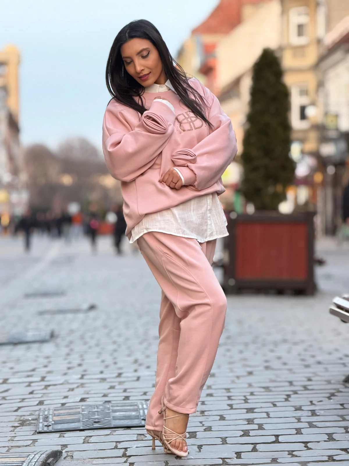 Compleu dama roz pudrat cu detaliu floral la maneci