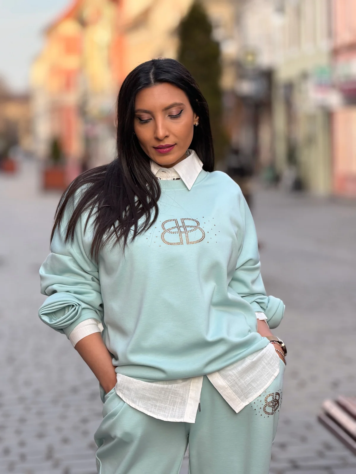 Compleu dama verde menta cu detaliu floral la maneci