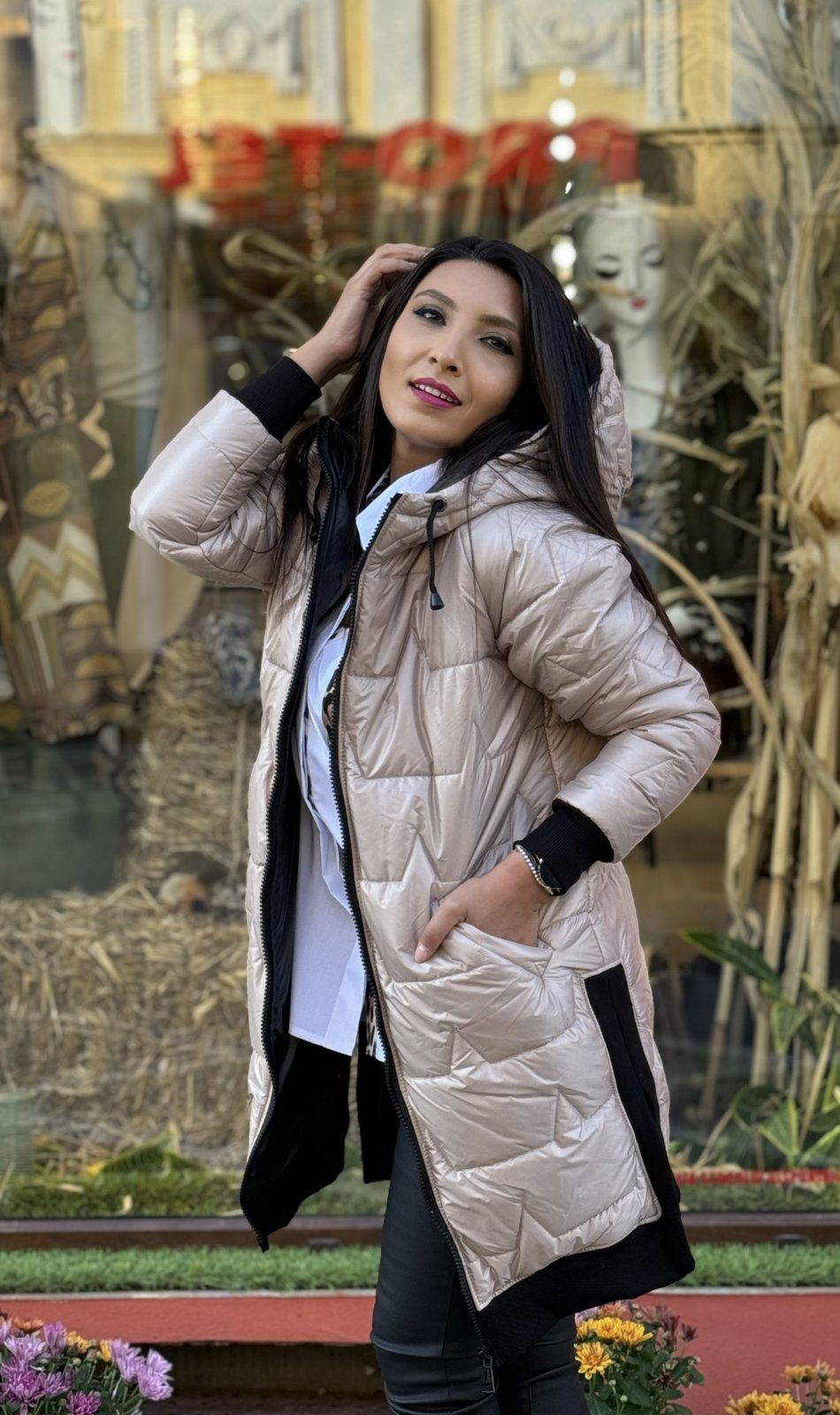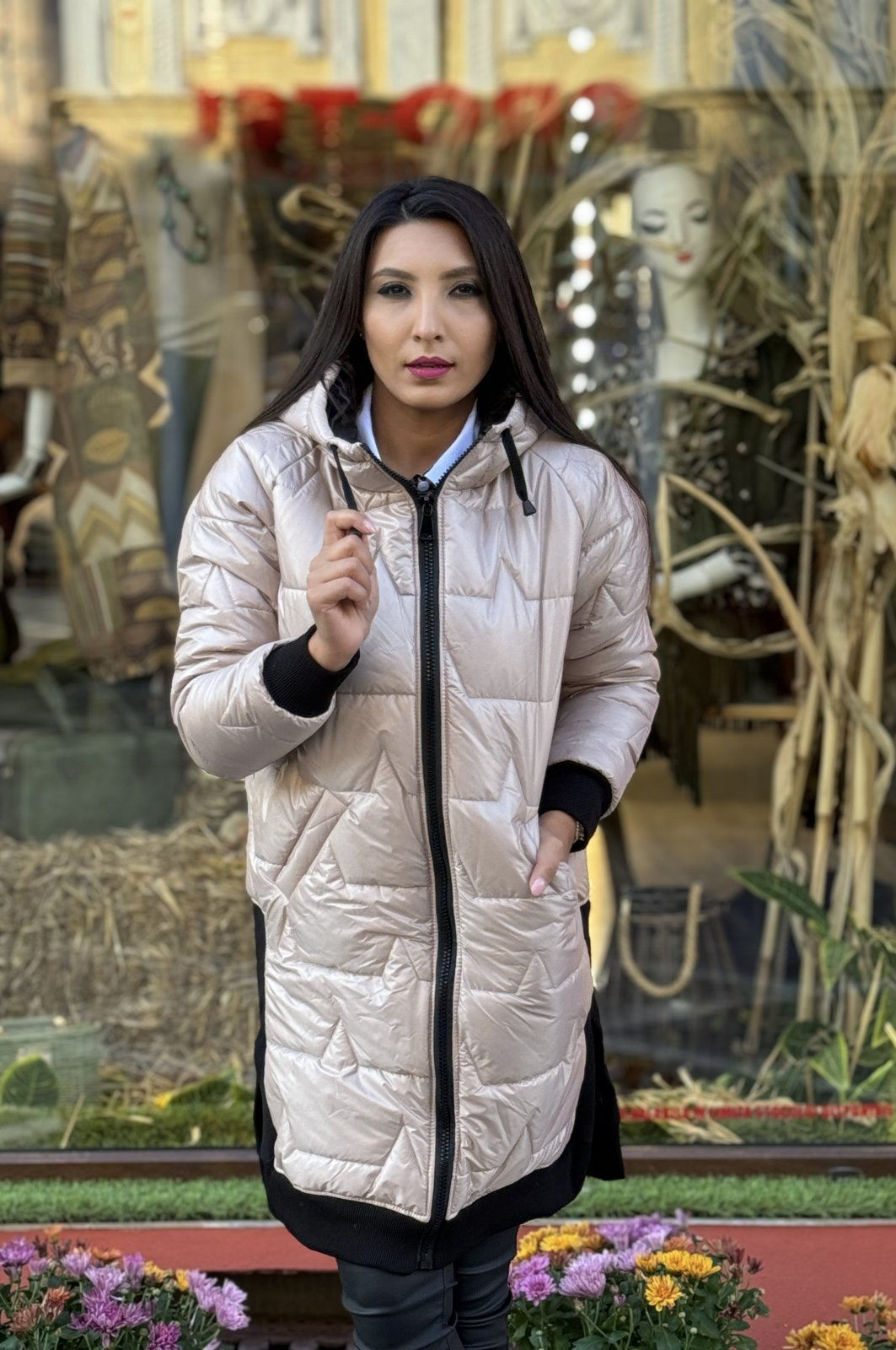 • Geacă elegantă în nuanță bej, cu glugă practică