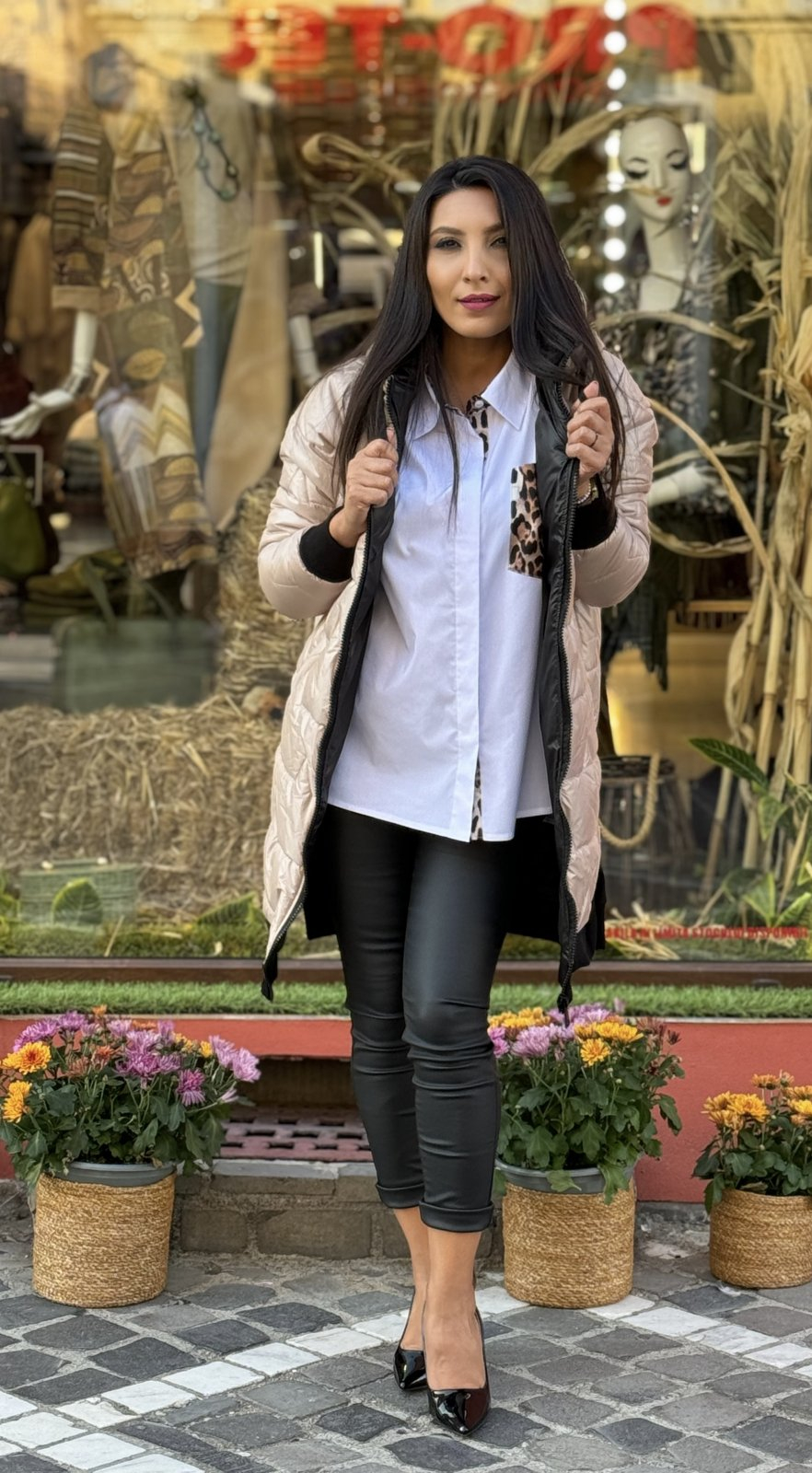 O poți combina cu pantaloni uni, fustă neutră sau chiar rochie simplă; lasă geaca să fie punctul de atracție al ținutei tale. Cu această geacă alegi să fii feminină și protejată de intemperii, fără să renunți la stil și personalitate.