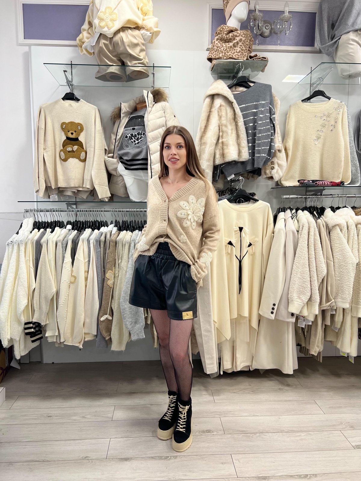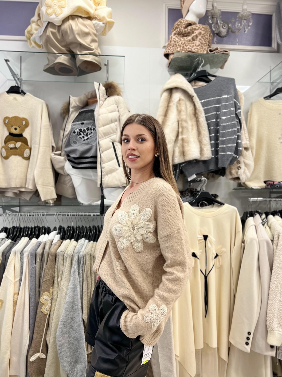 Într‑o nuanţă blândă de crem, această jachetă cu aplicaţii de flori croşetate te poartă într‑o lume de armonie şi delicateţe. Mâinile care au croşetat fiecare petală au imortalizat o stare: aceea de linişte, de feminitate simplă, dar cu prezenţă. Când o porţi, ea îţi aminteşte că frumuseţea nu trebuie să fie zgomotoasă – poate fi elegantă, caldă, discretă.