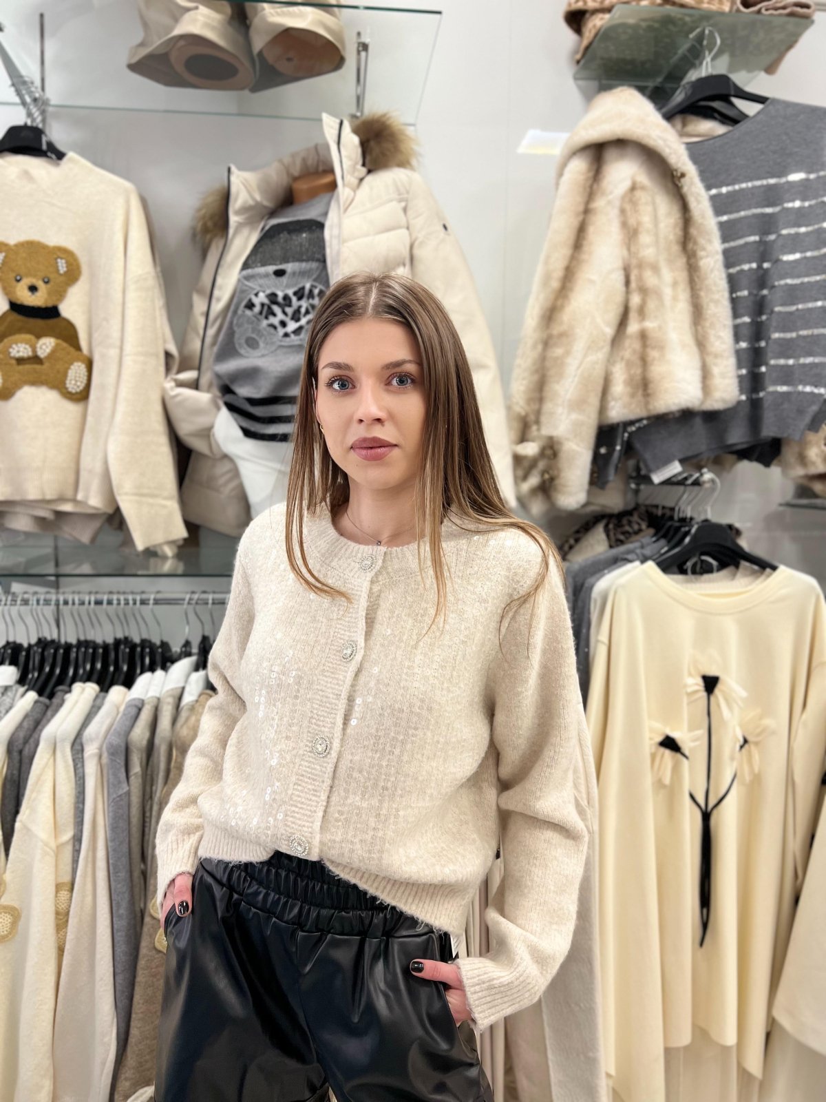 Într‑o nuanţă caldă de crem, această jachetă tricotată cu paiete transparente devine mai mult decât o haină — e o stare. O alegere pentru acele momente când vrei să te simţi bine, să dai frâu liber feminităţii tale şi să porţi ceva ce îţi reflectă rafinamentul discret. Paietele transparente se joacă cu lumina în cel mai blând mod, iar croiala jachetei lasă să zâmbească silueta fără să o strângă.