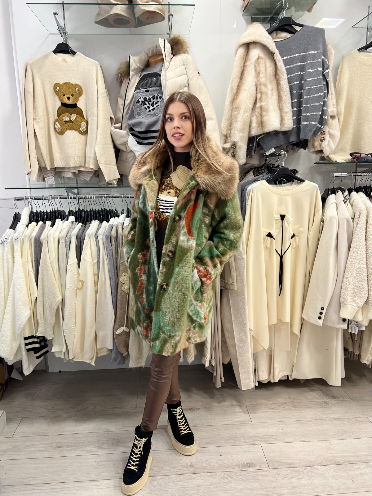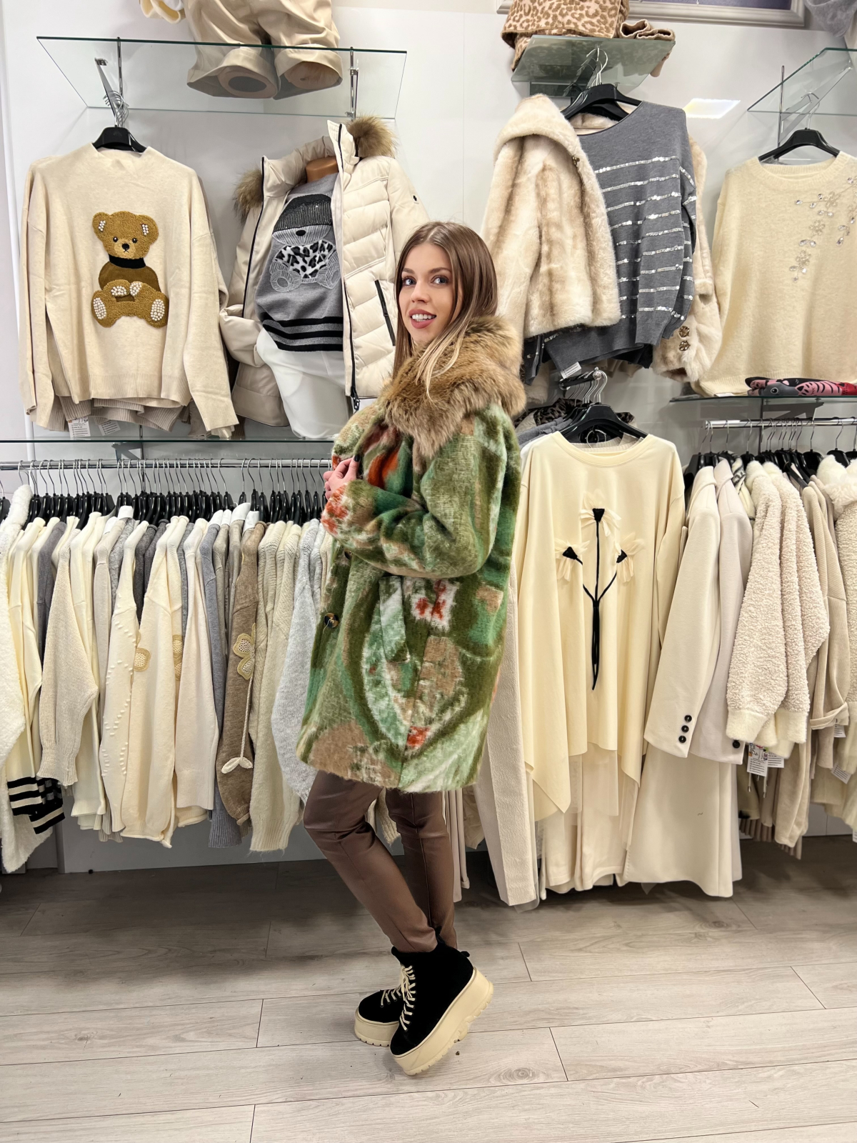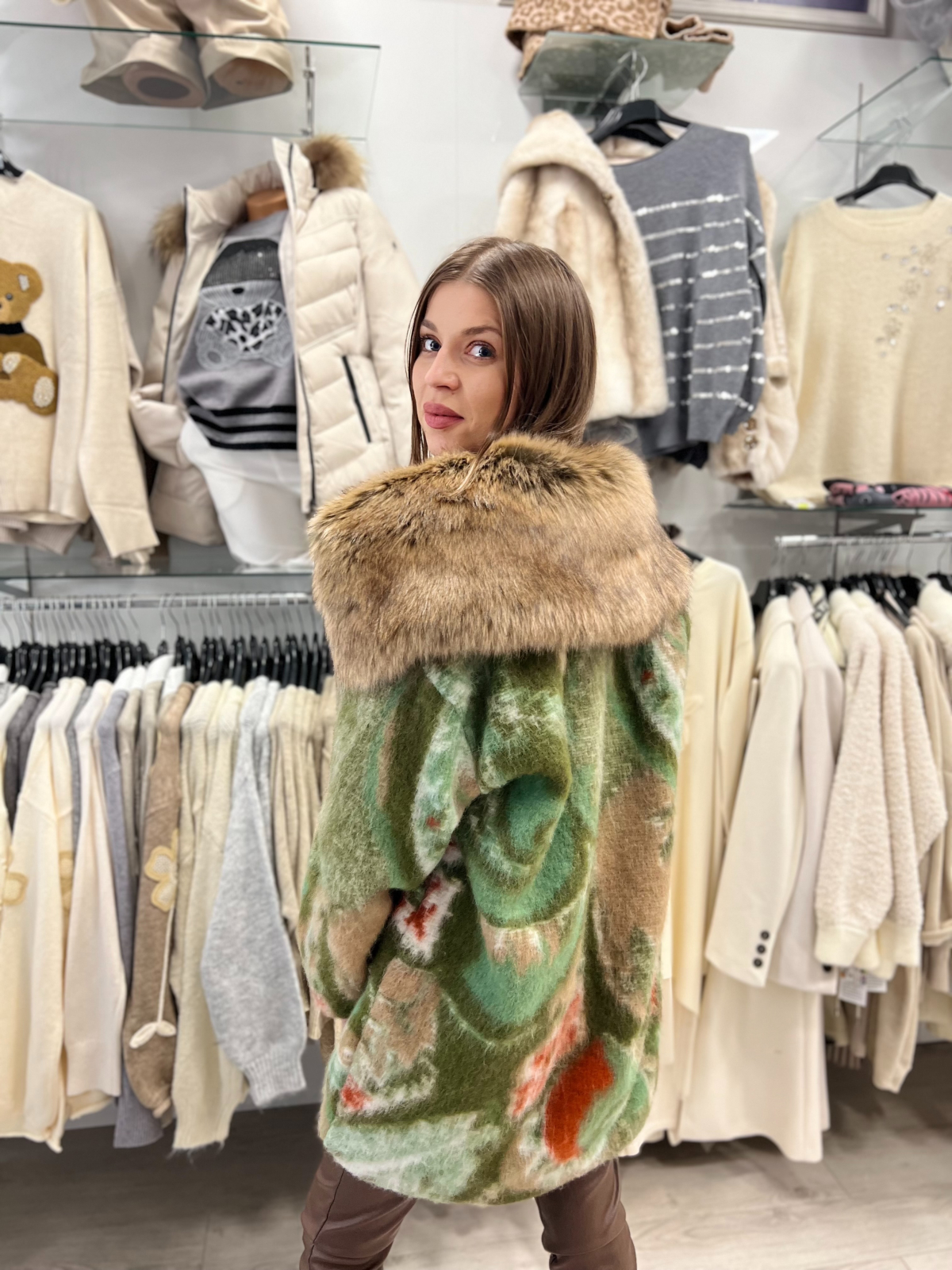 Fiecare femeie merită un palton care să o facă să se simtă elegantă, încrezătoare și protejată. Acest palton verde cu guler amplu din blană este exact acea piesă specială care adaugă rafinament și personalitate în zilele reci.