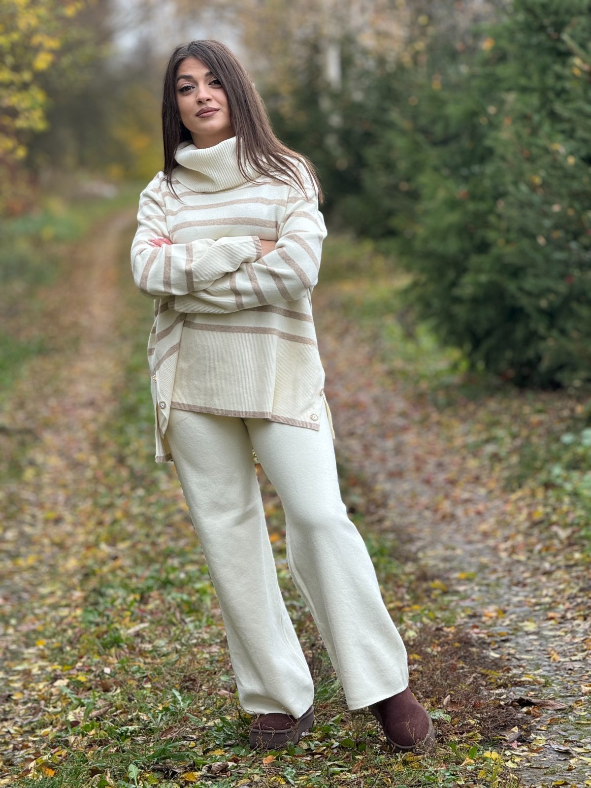 Cu un aer proaspăt și o eleganță calmă, acest compleu crem este ca o zi luminoasă de toamnă – cald, lejer și plin de rafinament. Gâtul înalt și dunga orizontală oferă un echilibru vizual frumos, iar nasturii aurii adaugă o notă subtilă de strălucire. Materialul tricotat îți oferă libertate și confort, urmând liniile corpului fără să le accentueze exagerat.