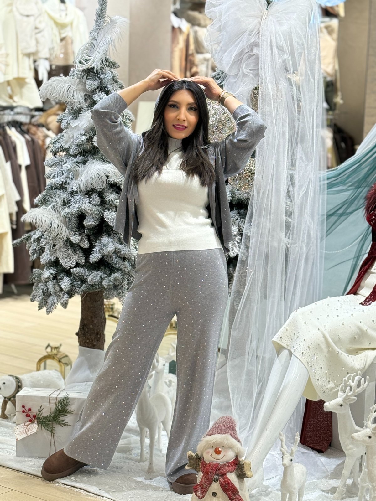 Pietricelele adaugă un strop de lumină și feminitate, iar culoarea gri transmite echilibru, simplitate și versatilitate. Este ținuta perfectă pentru femeia care apreciază nu doar imaginea, ci și starea de bine din spatele fiecărei alegeri.