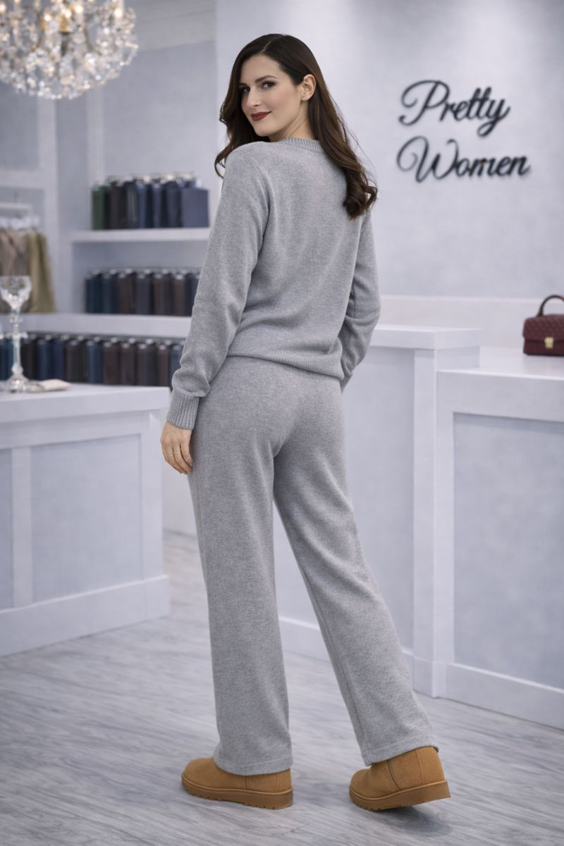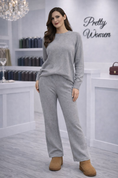 Compleul gri tricotat este exact genul acela de piesă care nu te forțează să alegi între confort și rafinament.