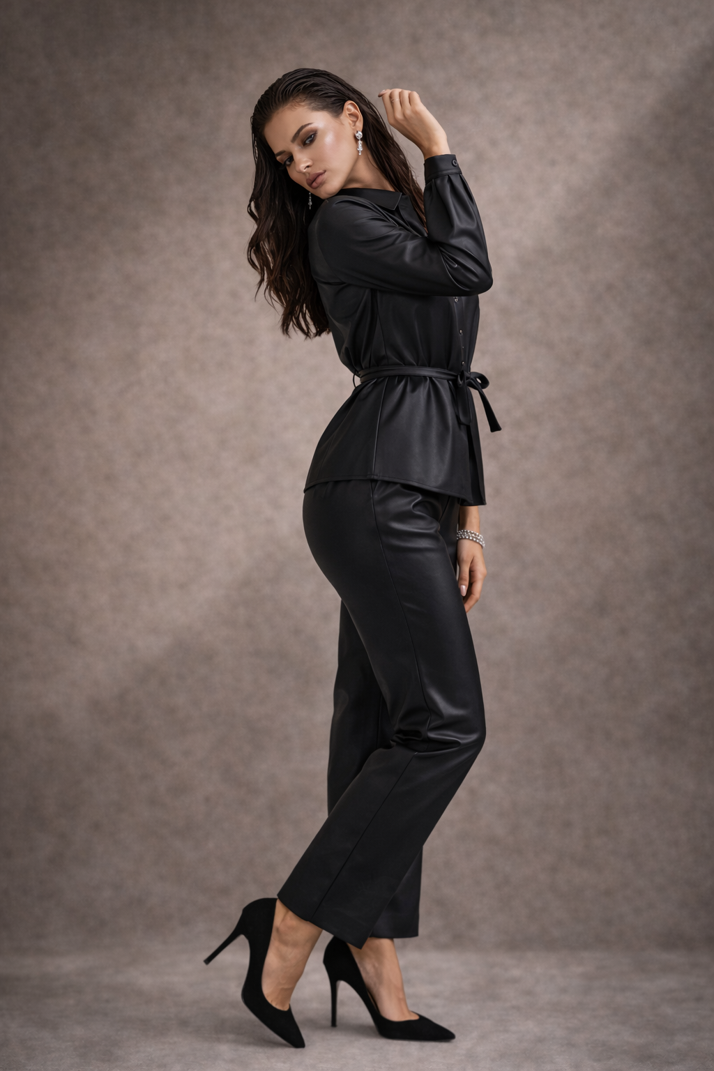 Acest compleu negru din piele ecologică este pentru femeia care nu se teme să fie remarcată. Format din sacou cambrat și pantaloni eleganți, cu o croială ce urmează linia corpului, este piesa ideală pentru a face o impresie de neuitat, fie la birou, fie la un eveniment special.