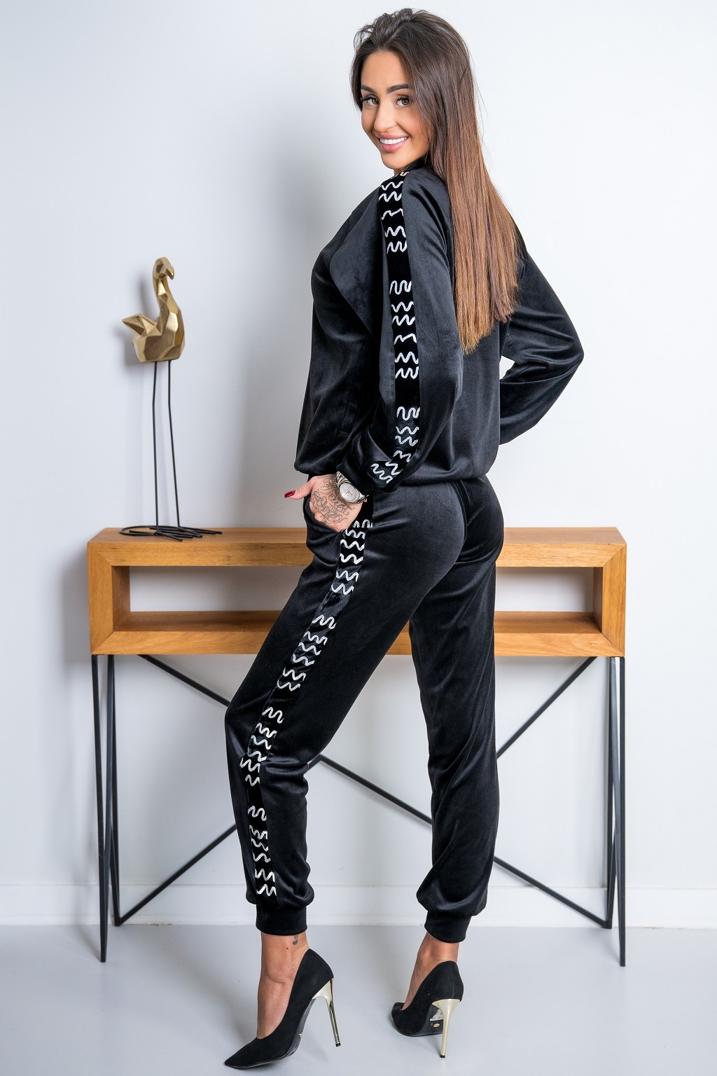Acest trening din catifea neagră este alegerea perfectă pentru femeia care vrea să arate bine chiar și în cele mai confortabile momente. Detaliul decorativ de pe lateral adaugă un strop de dinamism și rafinament, în timp ce fermoarul frontal oferă lejeritate și versatilitate în purtare.