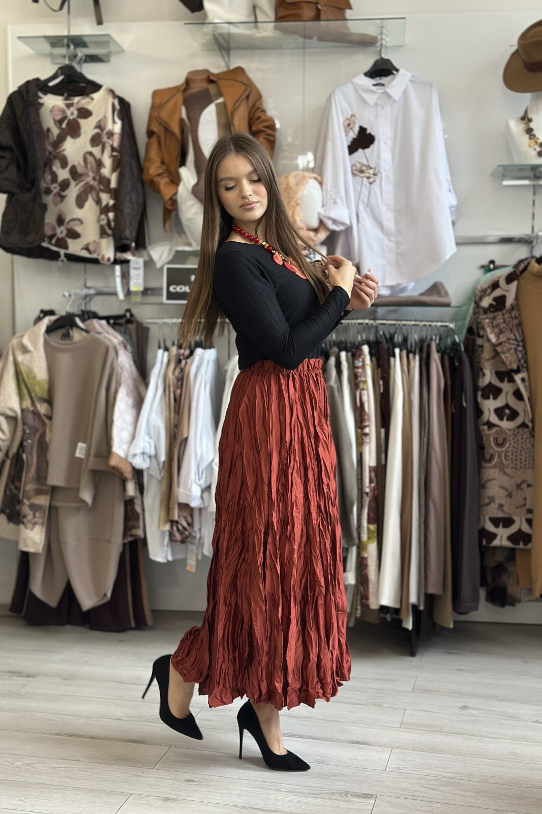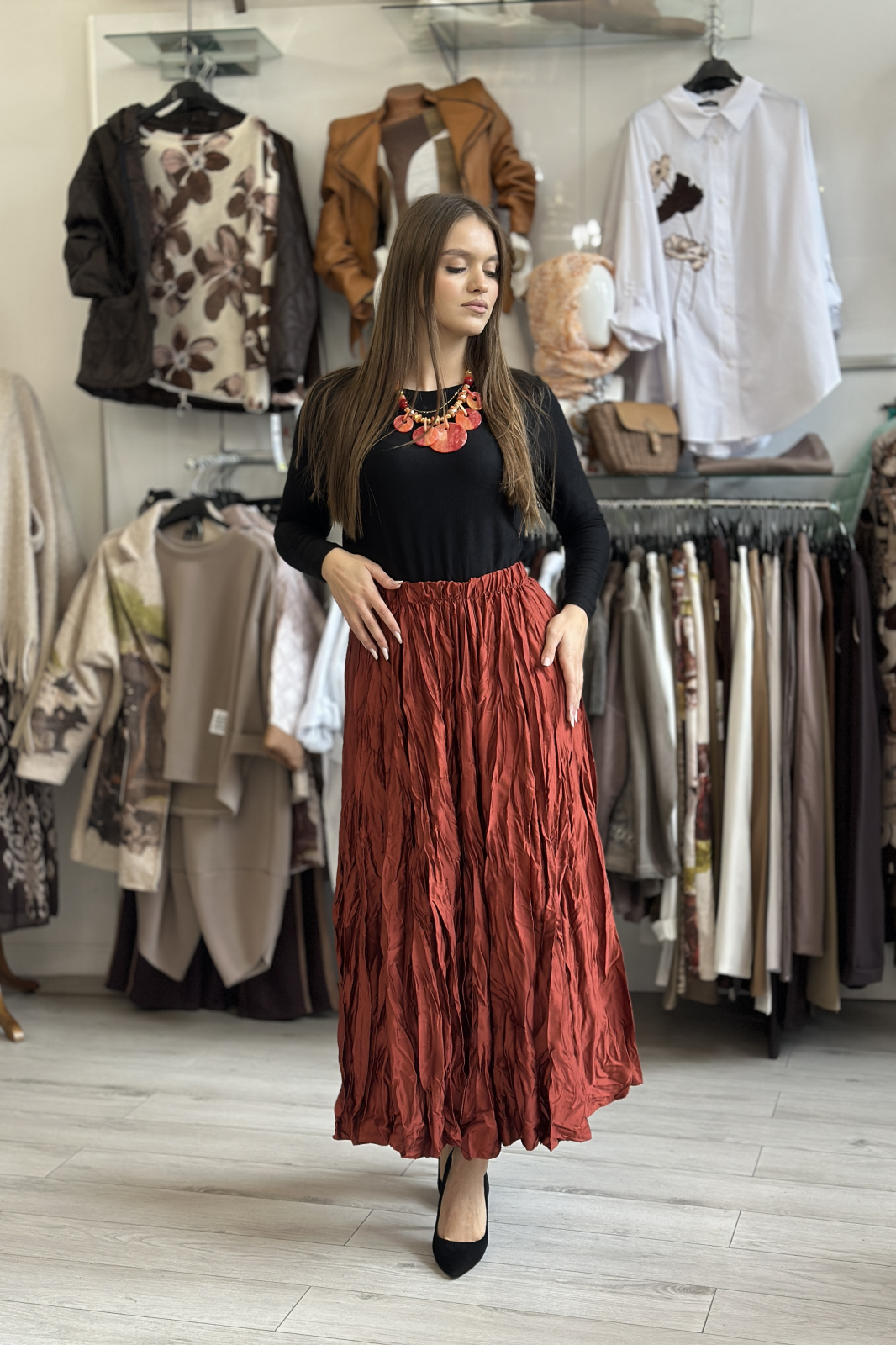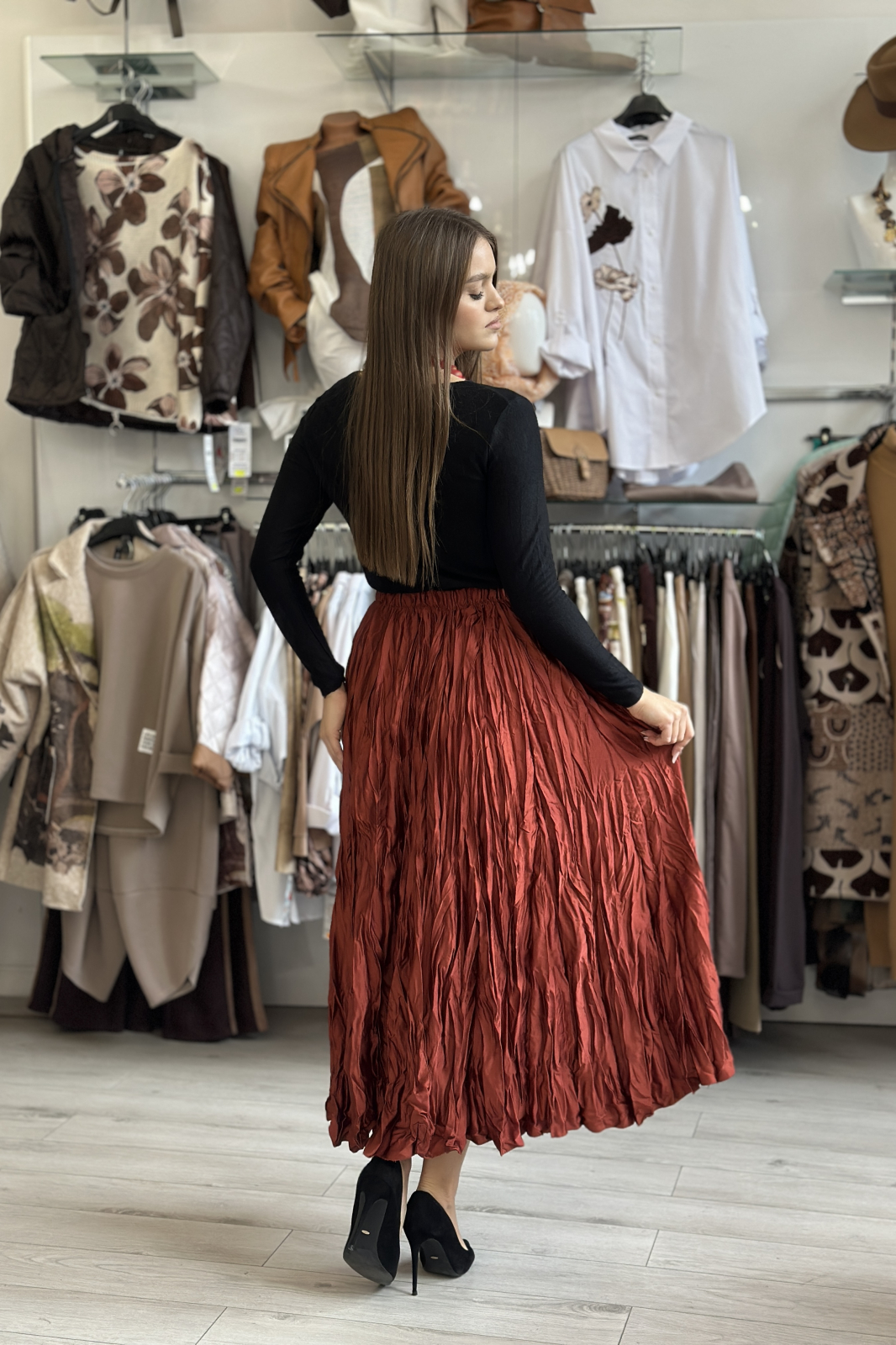 Fusta lungă creponată în nuanța cărămizie e ca o plimbare lină printr-o zi de toamnă caldă. Fluidă, ușoară și plină de personalitate, această piesă vestimentară se mișcă odată cu tine, oferindu-ți libertate și feminitate.