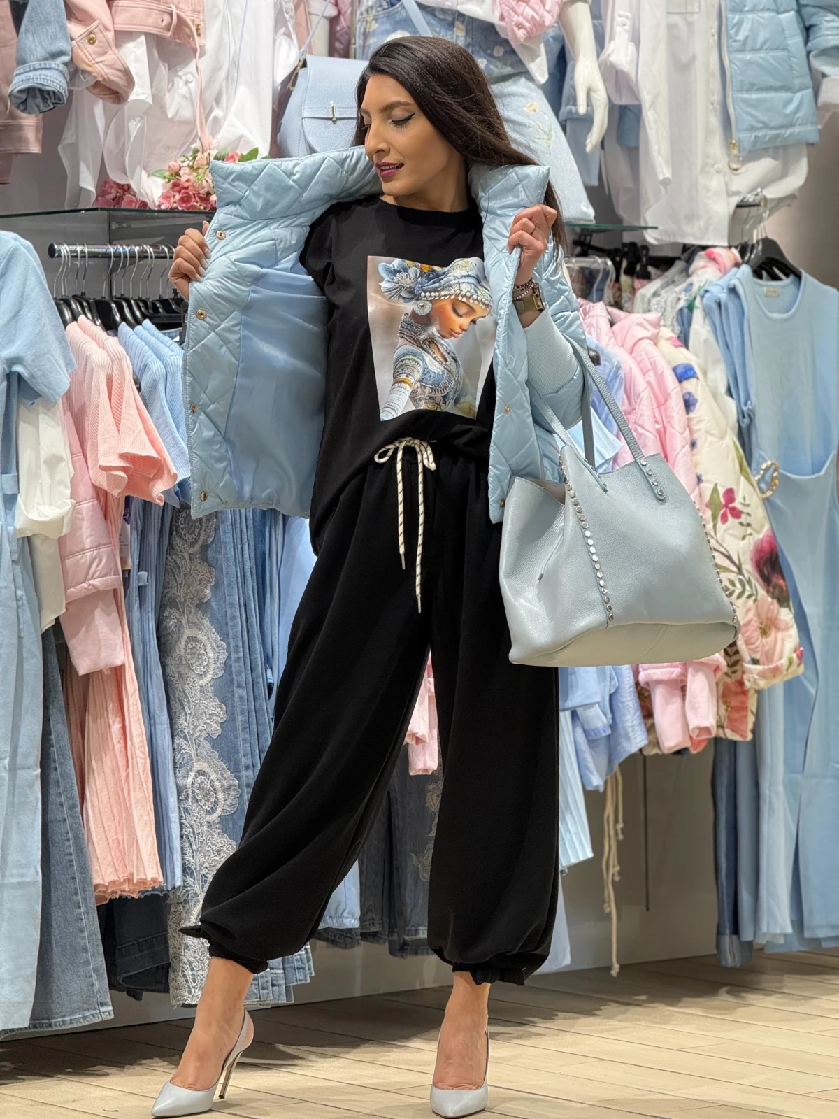Culoarea bleu delicată evocă liniște și prospețime, fiind perfectă pentru zilele în care vrei să te simți încrezătoare și aliniată cu cele mai rafinate tendințe. Croiala matlasată oferă un aspect vizual sofisticat și o protecție plăcută împotriva răcelii, în timp ce elasticul din talie și manșetele la mânecă subliniază armonios silueta și adaugă un plus de confort la fiecare mișcare.