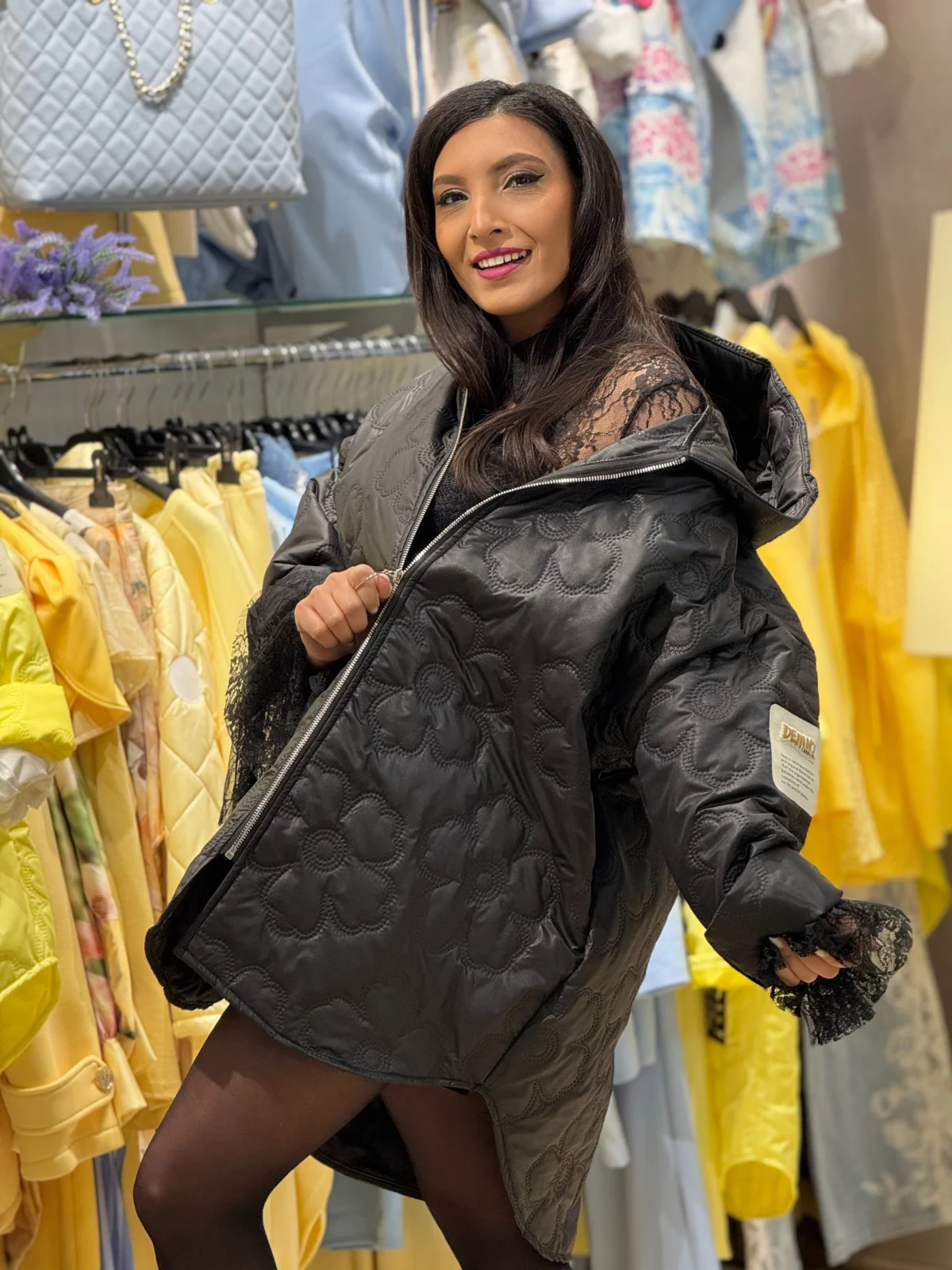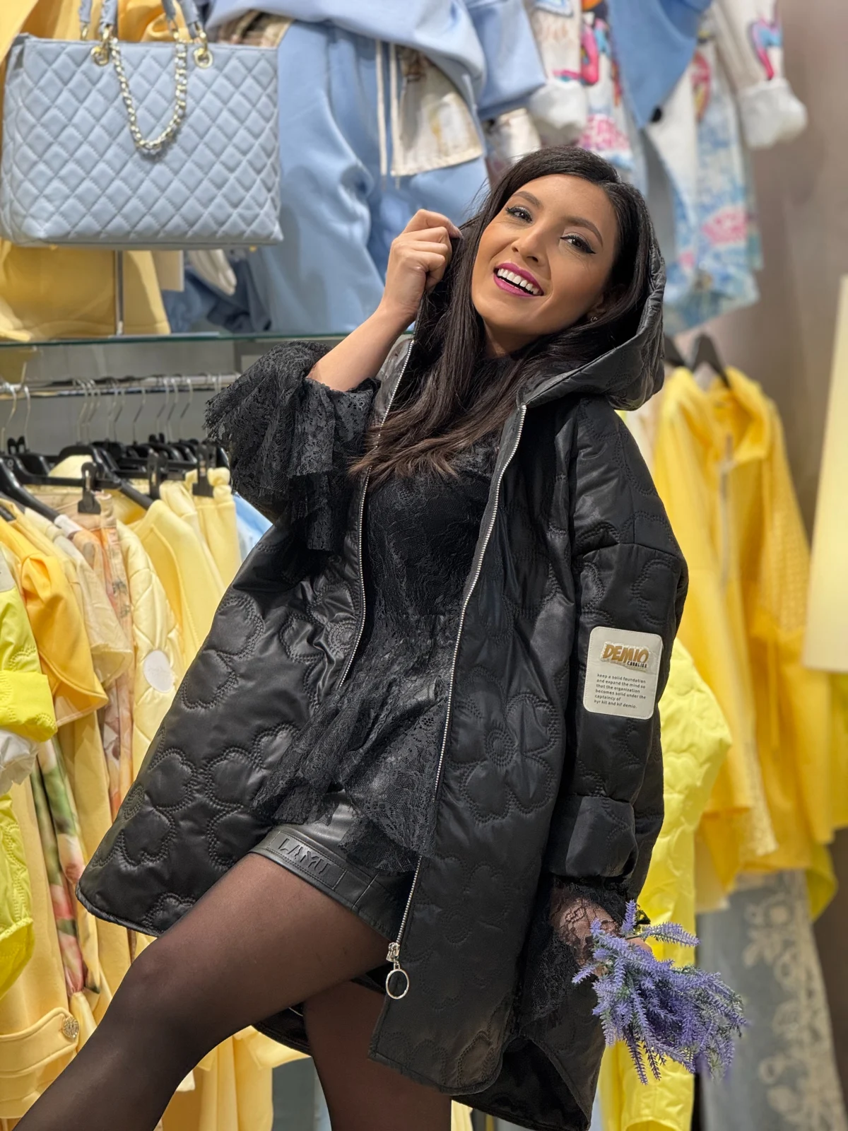 Geaca dama neagra cu broderie florala si gluga