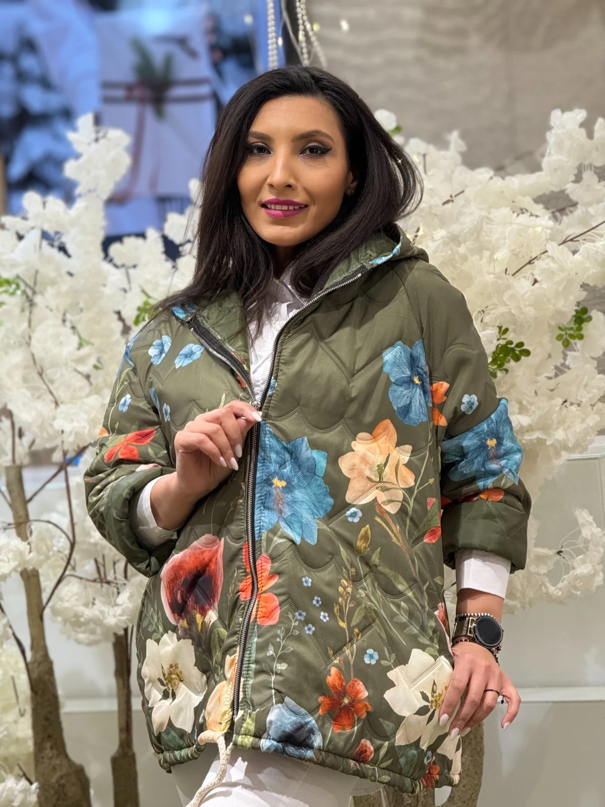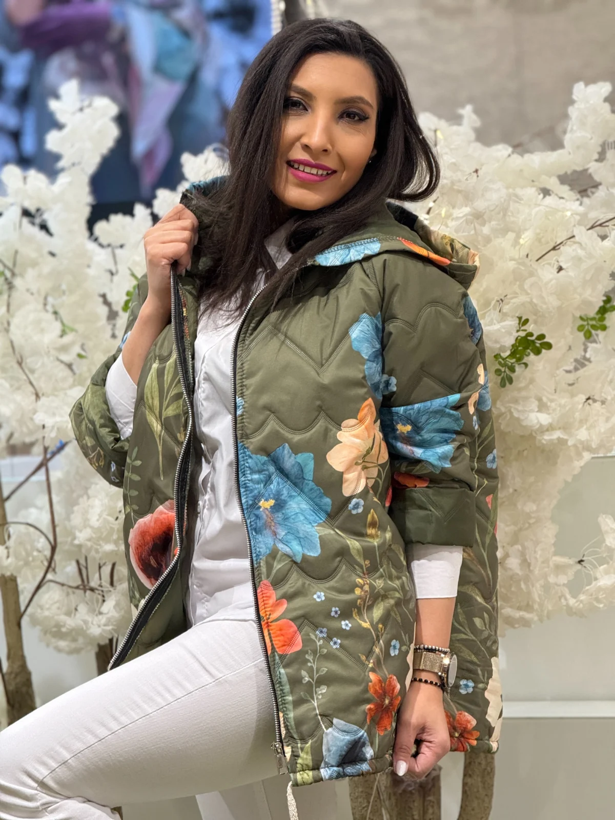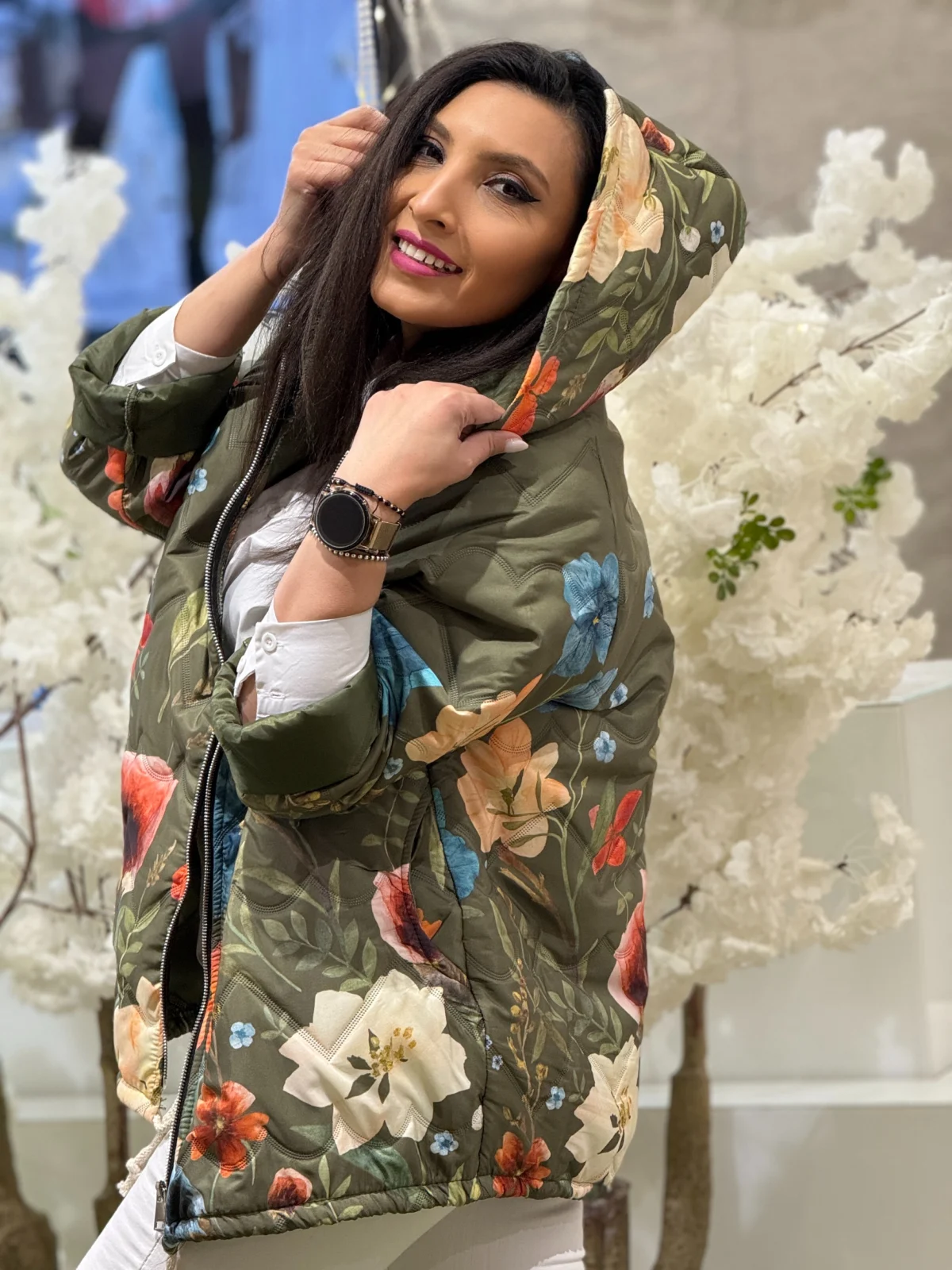 Geaca dama verde cu gluga si imprimeu flori