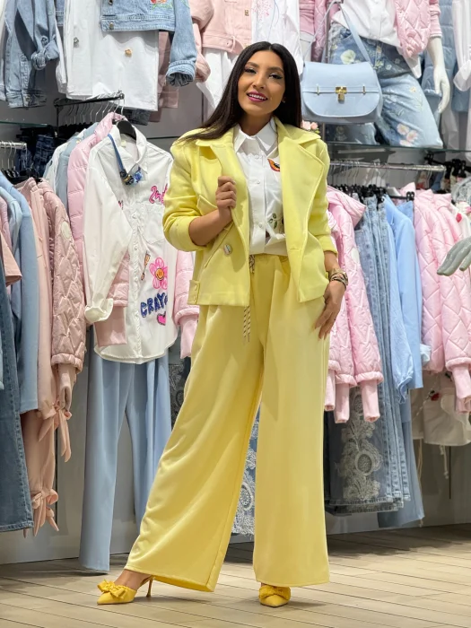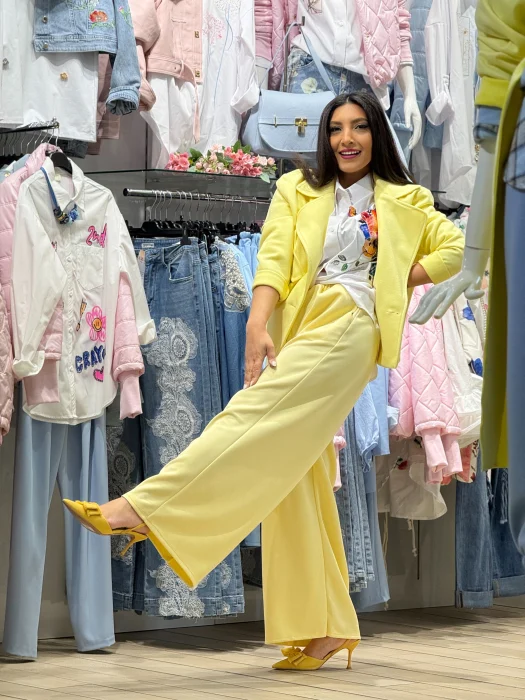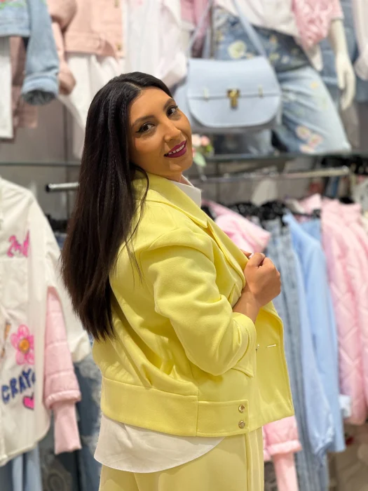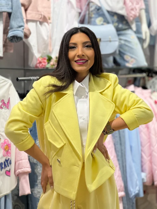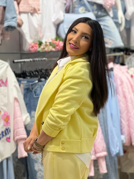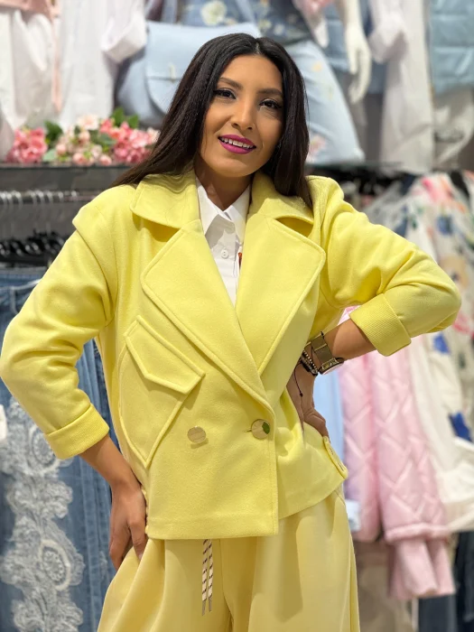 Jacheta damă galbenă cu buzunar lateral aplicat oblic este piesa care aduce lumină și personalitate garderobei tale. Nuanța vibrantă de galben inspiră optimism și vitalitate, fiind alegerea perfectă pentru femeia care își dorește să iasă discret în evidență prin stil și atitudine.