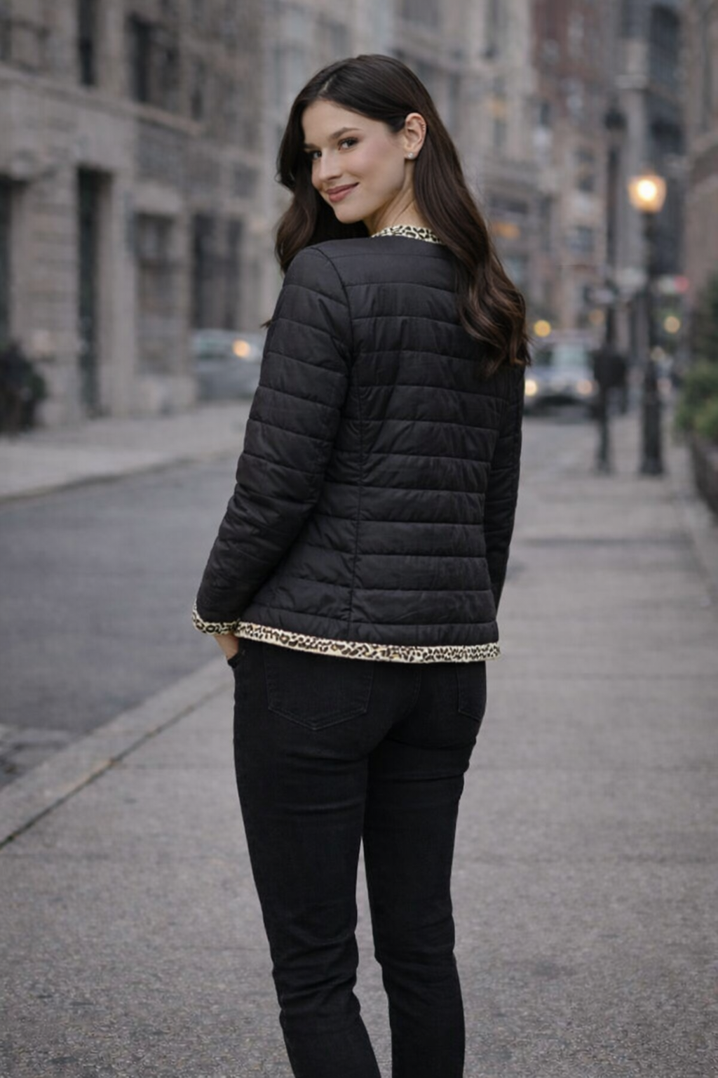 Această jachetă neagră scurtă cu guler rotund este alegerea ideală pentru femeia care preferă liniile curate și detaliile discrete. Croiala dreaptă avantajează silueta, iar gulerul rotund adaugă un accent feminin și sofisticat. Nuanța clasică de negru o face ușor de asortat cu orice ținută, de la office la ocazii speciale.
