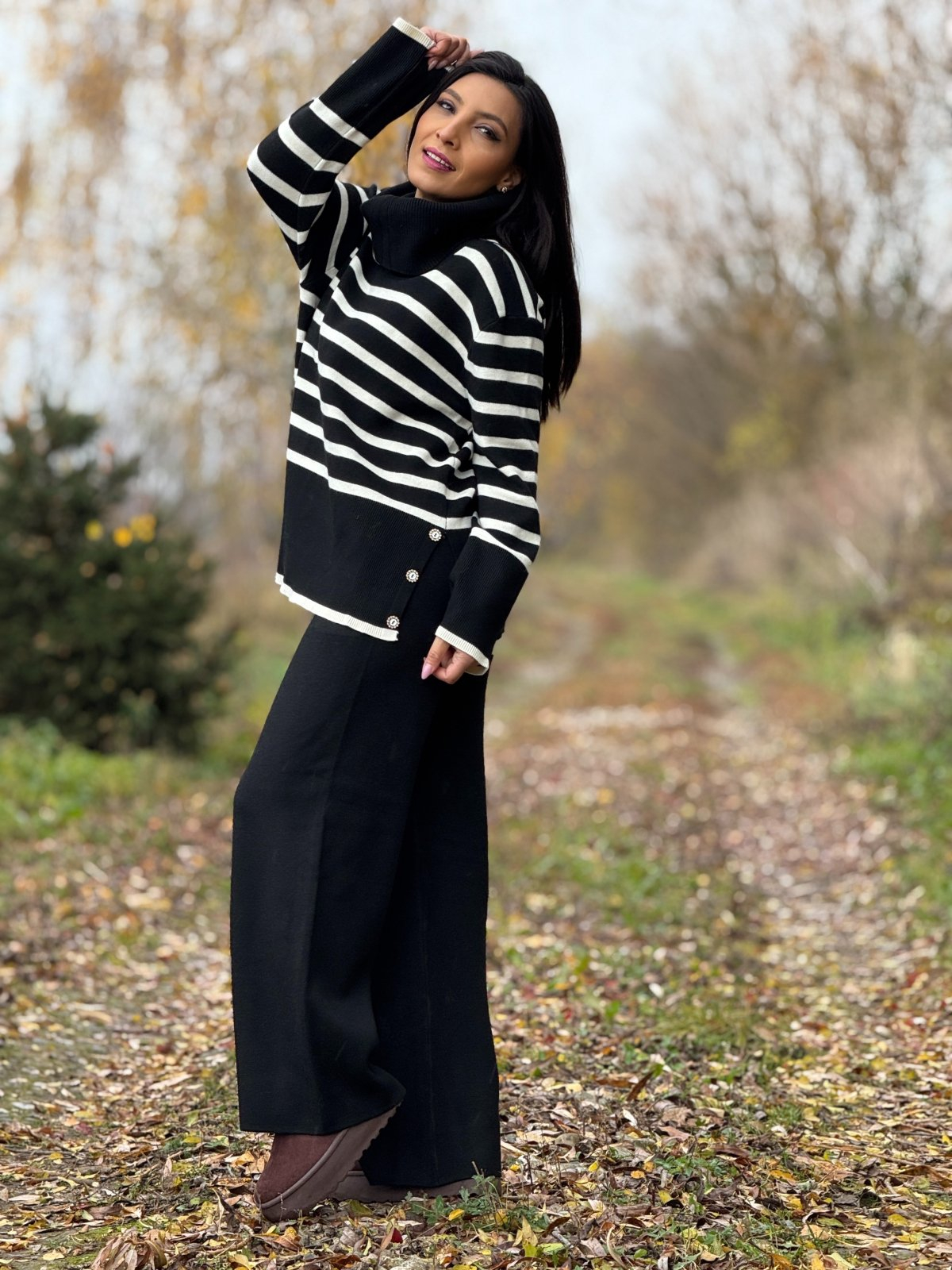În acele zile când vrei să te simți elegantă fără compromisuri în privința confortului, acest compleu tricotat negru este alegerea perfectă. Cu un design modern, dar subtil, și o culoare clasică ce exprimă rafinament, îți oferă un look casual-chic perfect pentru sezonul rece. Materialul moale și elastic se așază delicat pe formele tale, iar bluza ușor asimetrică, cu nasturi aurii și gât înalt, adaugă un plus de personalitate ținutei.