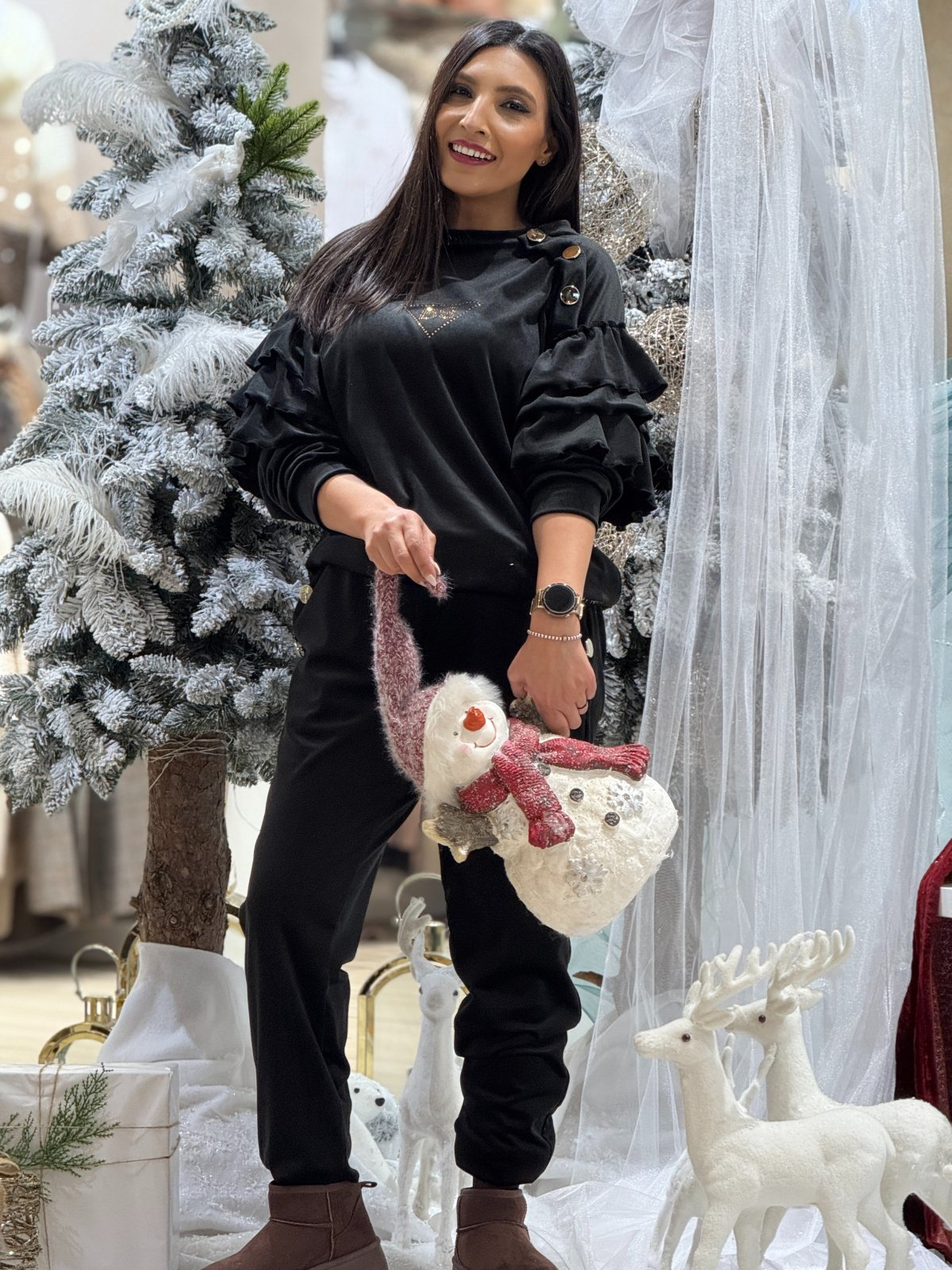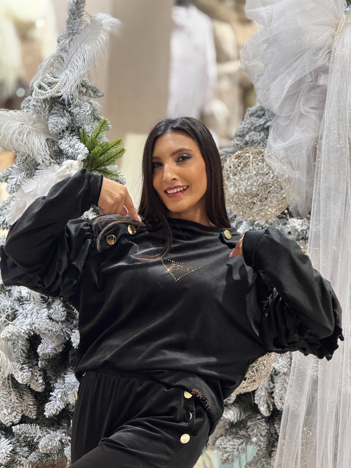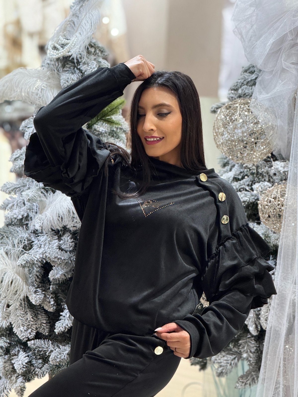 Un trening care îmbină confortul cu stilul sofisticat? Da, există. Iar acesta este exemplul perfect. Realizat într-o nuanță neagră intensă, cu o textură moale și un design modern, acest set iese din tiparele obișnuite prin detalii care contează: volănașele delicate de pe mâneci, nasturii aurii decorativi și aplicația discretă care adaugă un strop de strălucire.