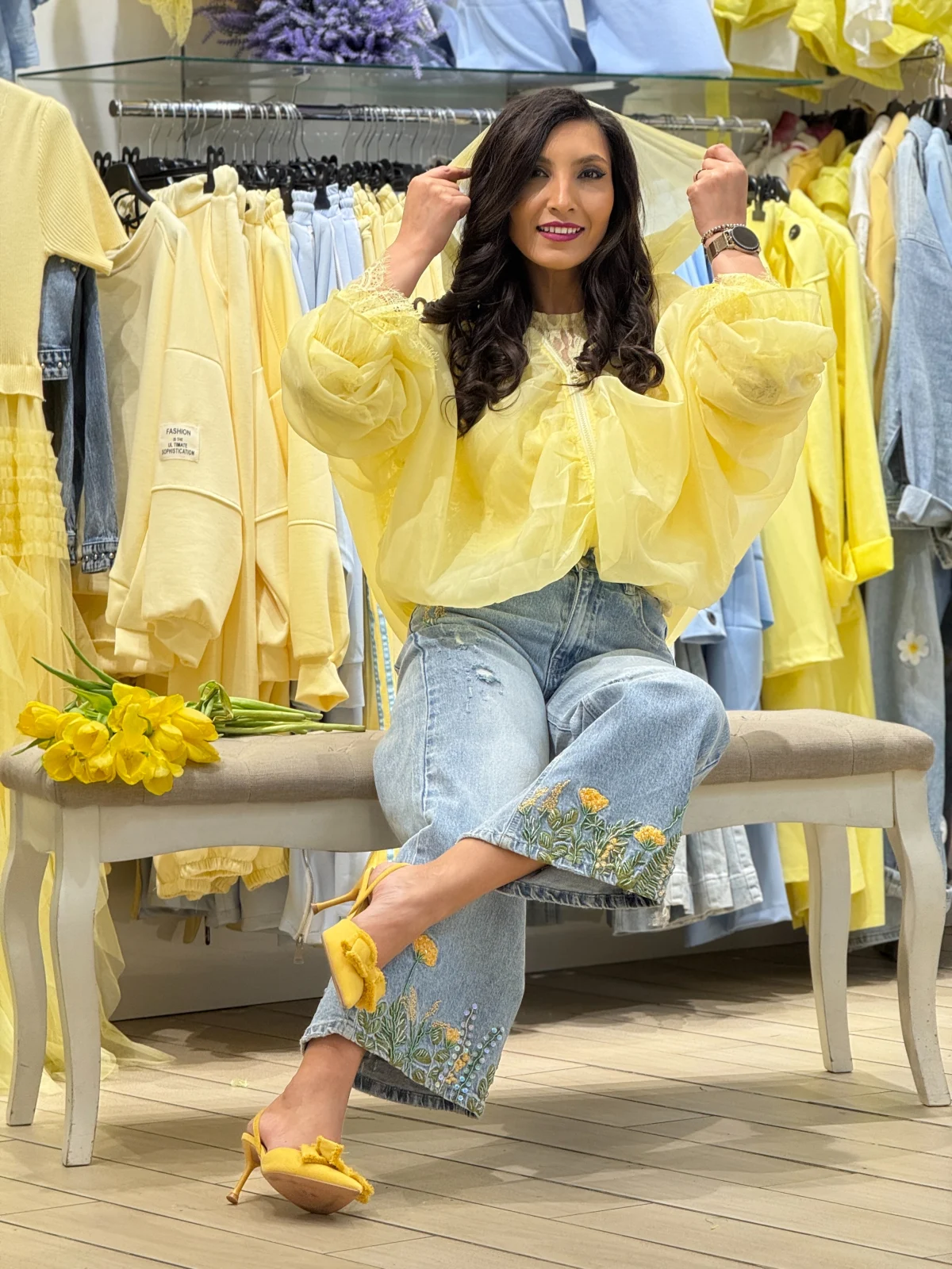 Blugi dama albastri cu flori si pietricele