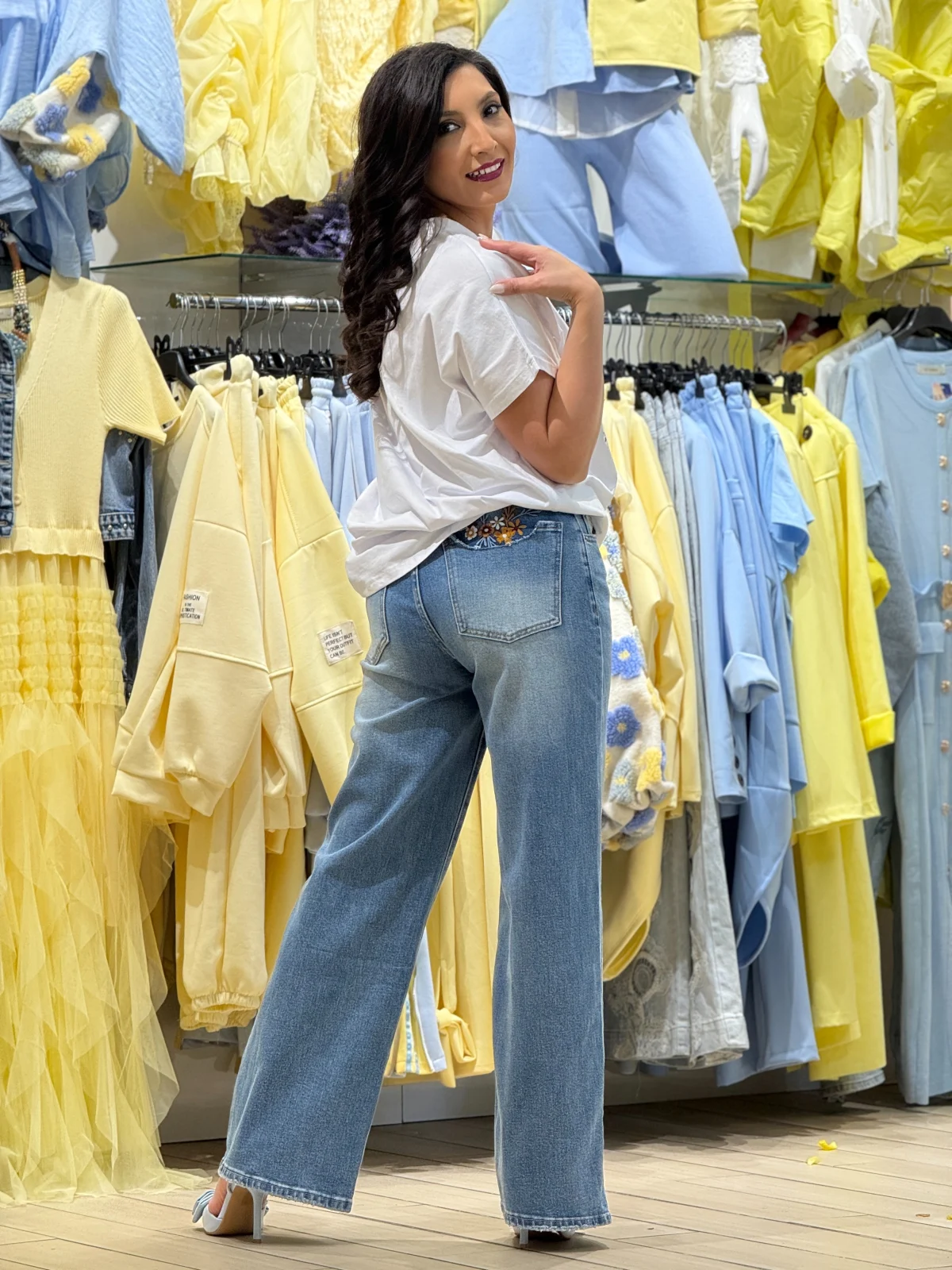 Blugi dama albastri drepti cu broderie la buzunare