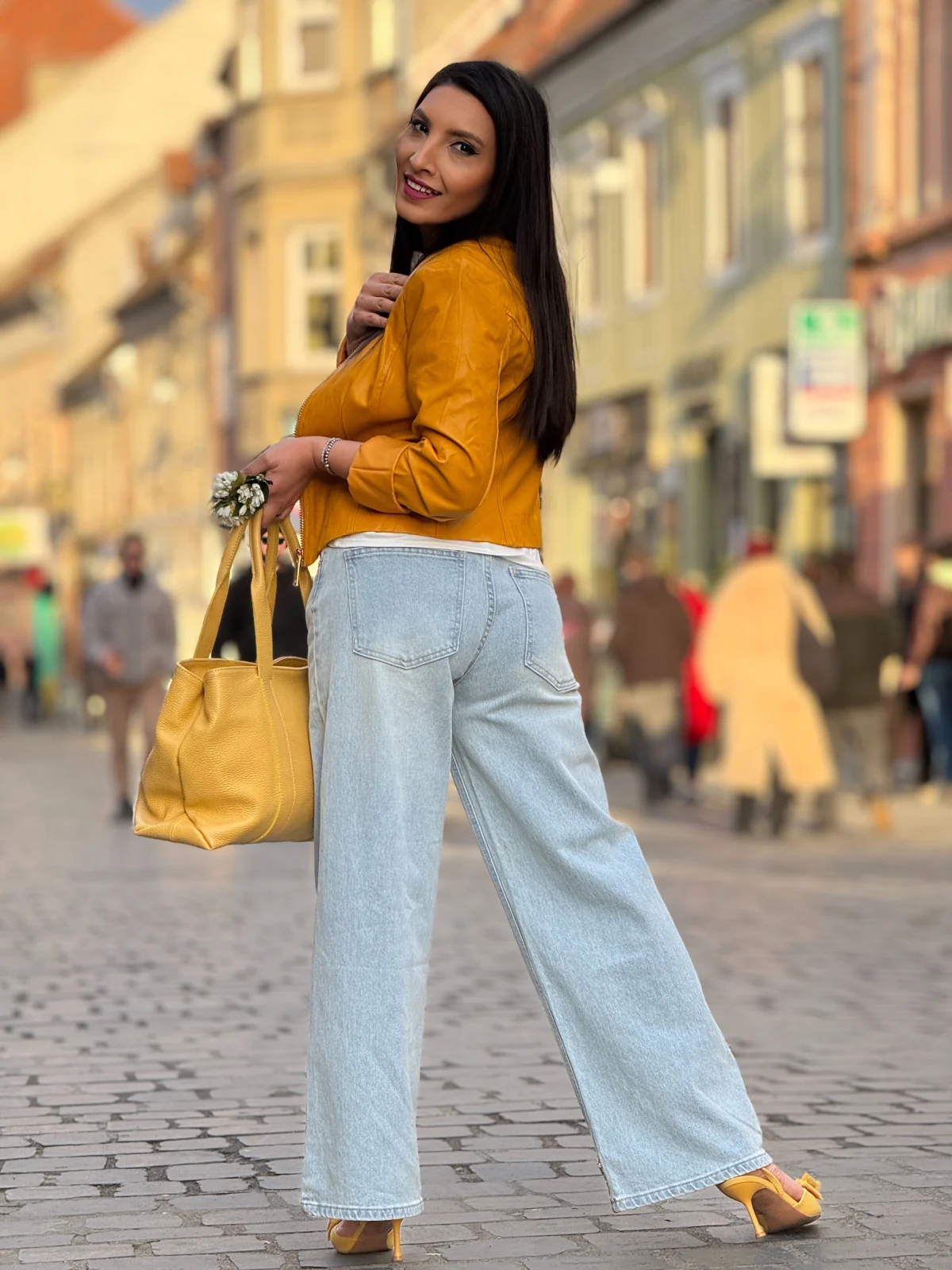 Blugi dama evazati cu broderie cu pietricele cu galben