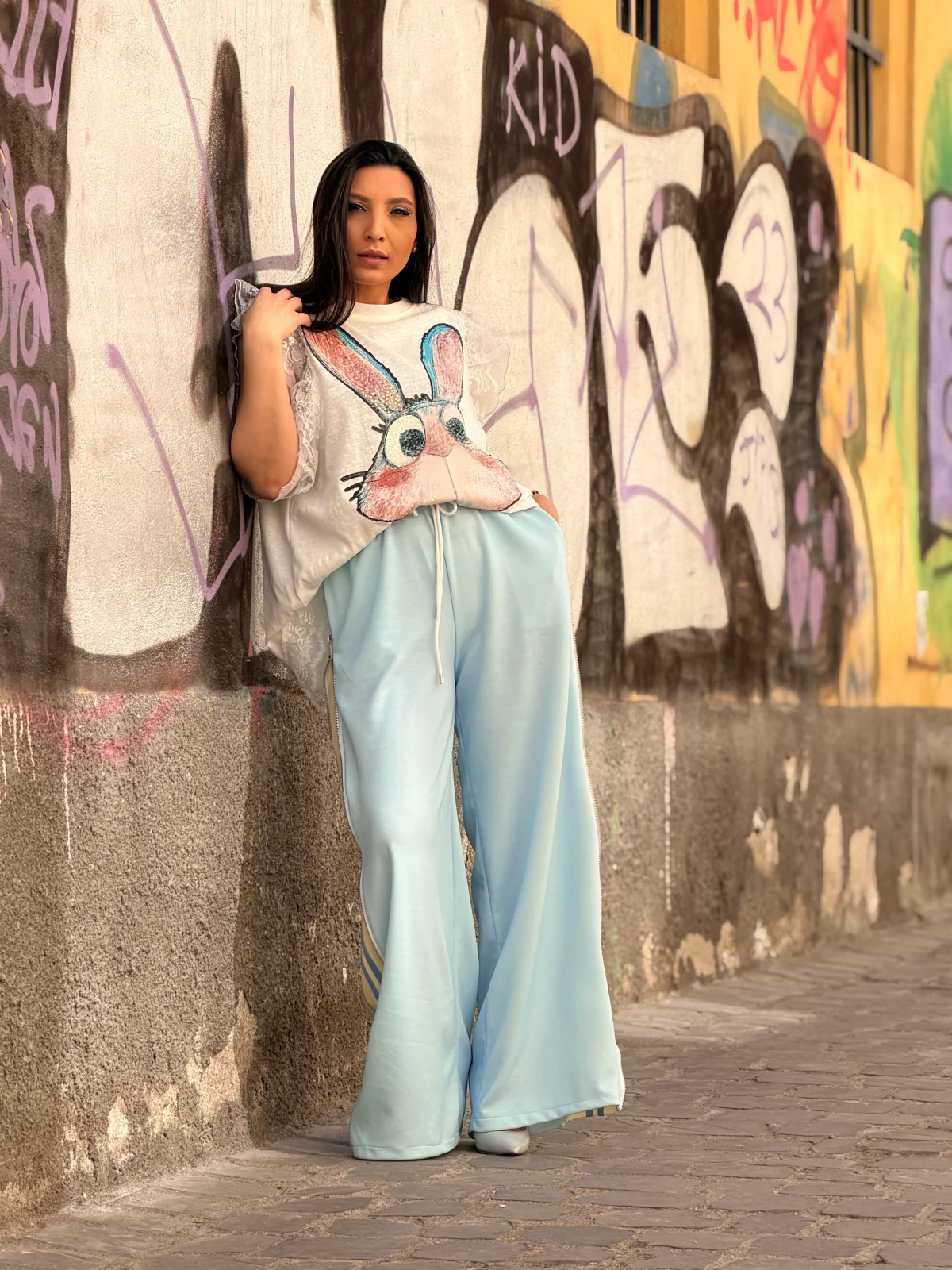 Pantaloni bleo cu fermoar pe lateral
