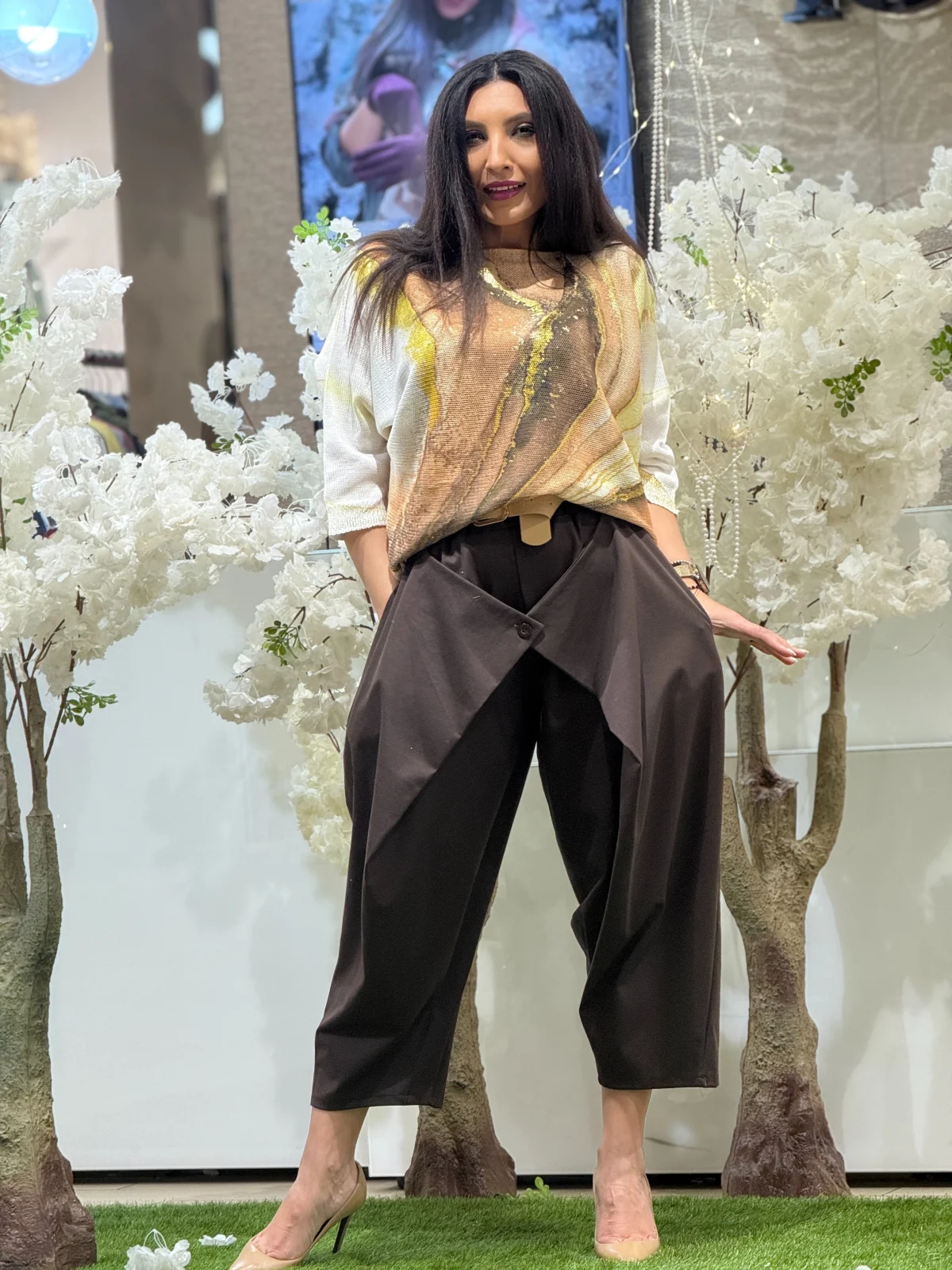 Pantaloni dama maro cu detaliu petrecut si curea in talie