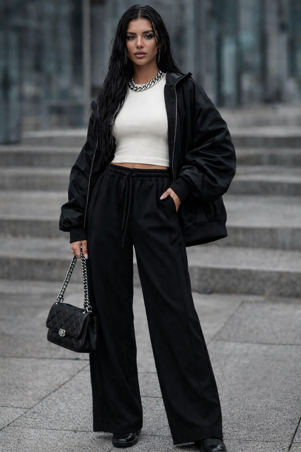 Pantaloni dama negri drepti cu elastic si snur in talie