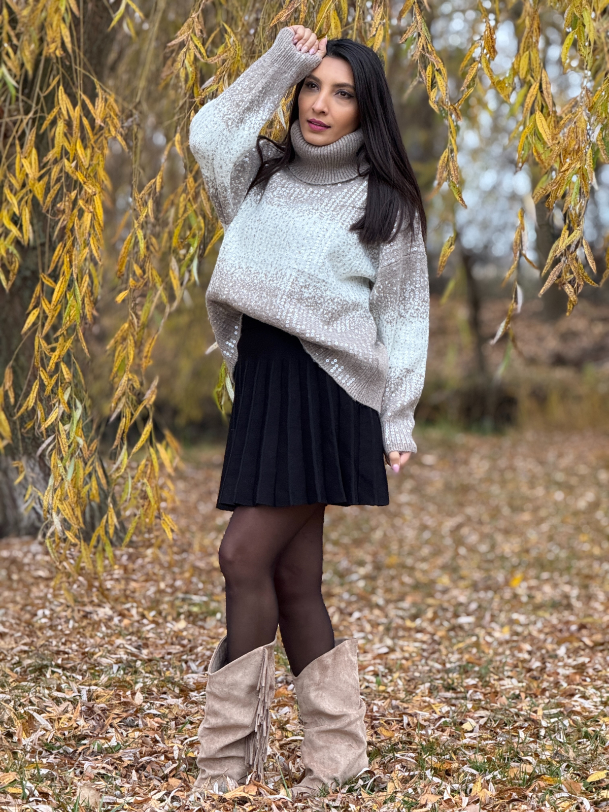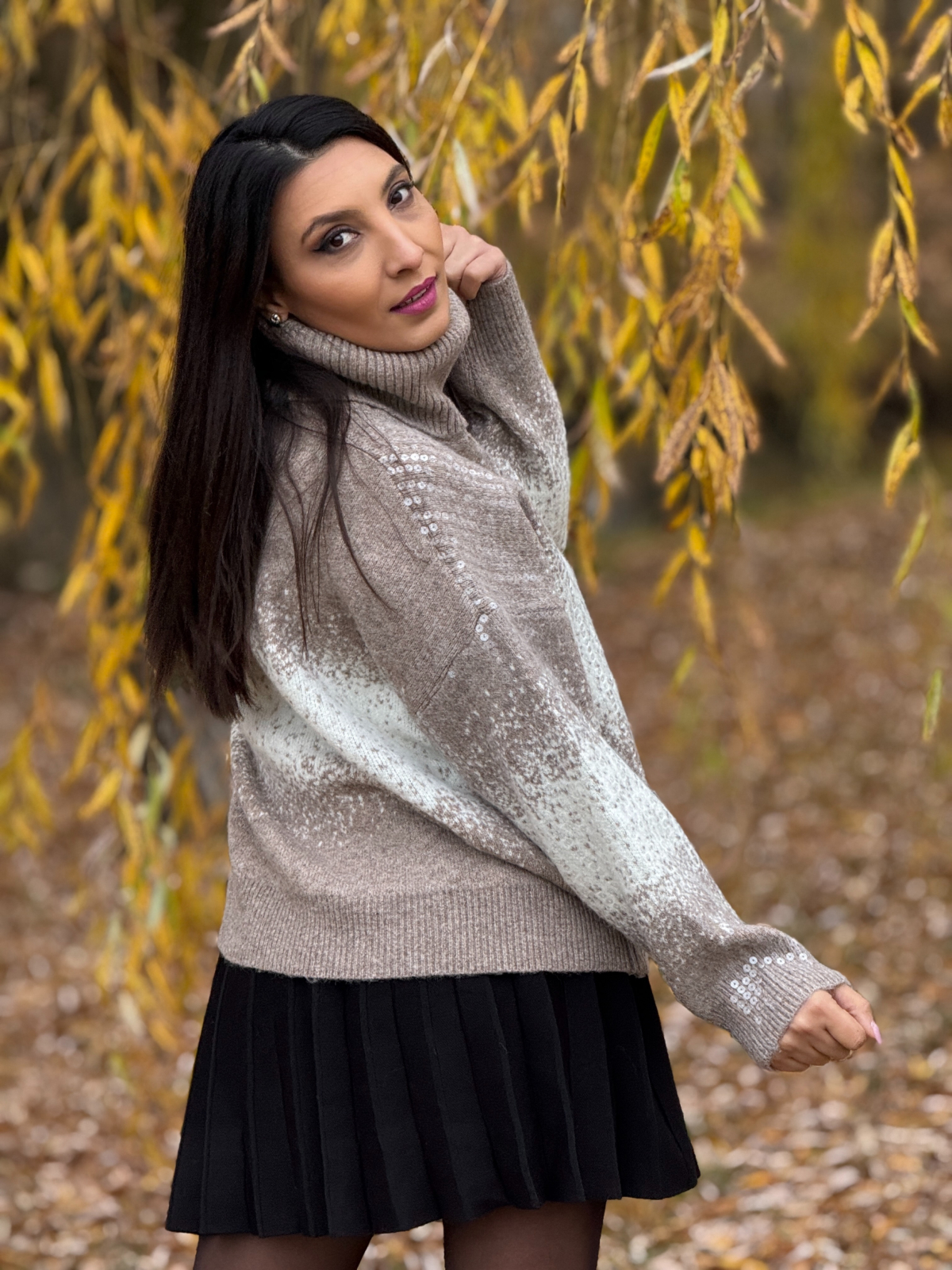 Îmbracă‑te în lumină blândă cu această bluza în nuanță de bej — un ton cald care seamănă cu primele raze ale dimineţii când totul pare posibil. Croiala cu gât înalt se aşază cu graţie, îți oferă acea închidere caldă de care ai nevoie în momentele mai aglomerate, iar paietele aplicate subtil sunt detaliul ce transformă simplul în memorabil: ca o rază ce traversează liniștea, fără să o tulbure.