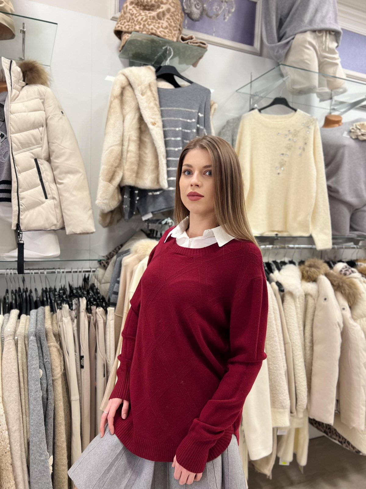 Bluza bordo cu guler decorativ – eleganţă subtilă într-o culoare intensă