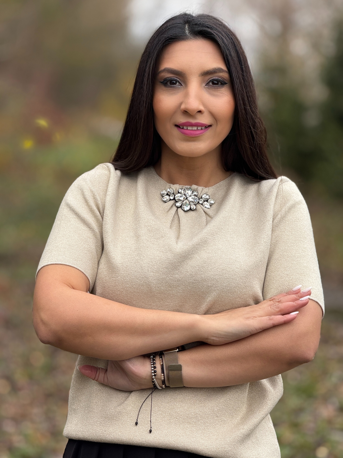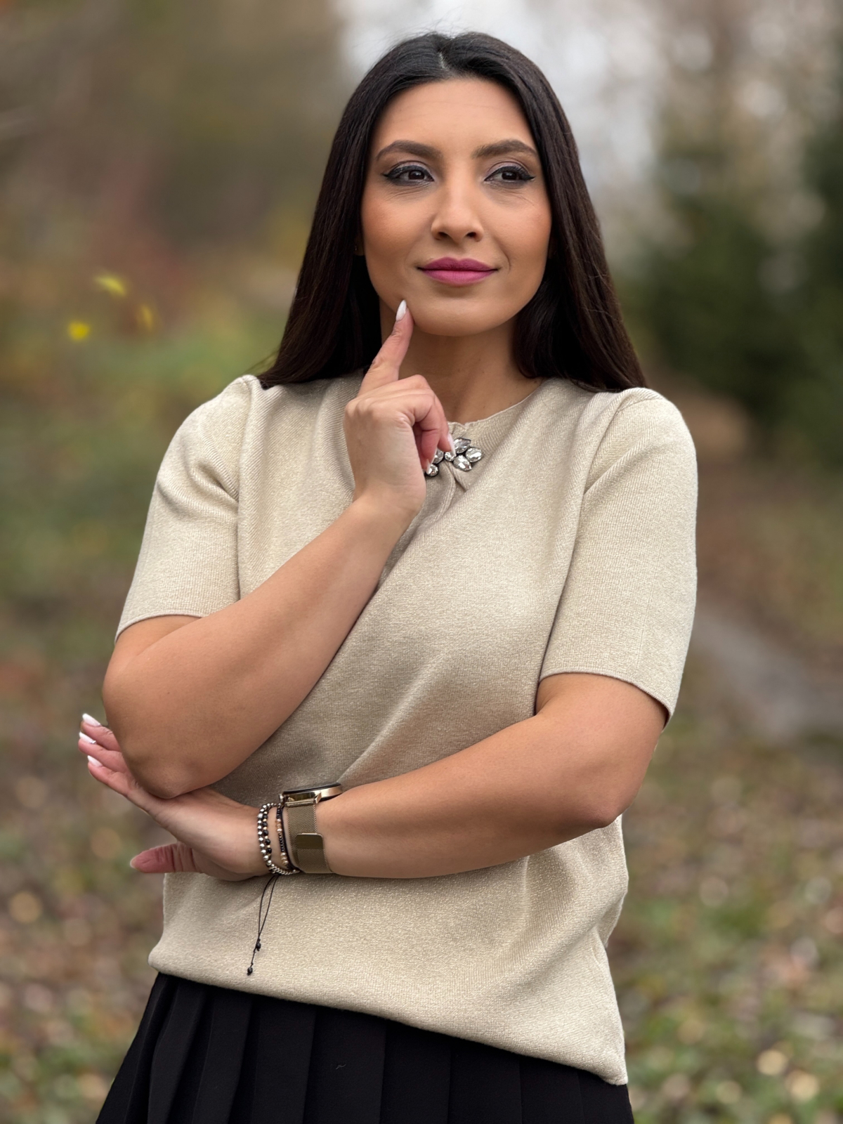 Acea piesă care îți dă un aer elegant fără să faci niciun efort? O ai în față. Bluza crem cu aplicație de pietricele la gât e ca o bijuterie integrată în ținută – discretă, dar fermecătoare. E blândă cu formele, moale pe piele și perfectă pentru zilele în care vrei să te simți frumoasă, fără să exagerezi.