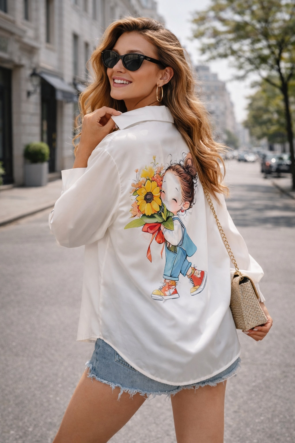 Camasa dama alba cu imprimeu fetita cu buchet de flori