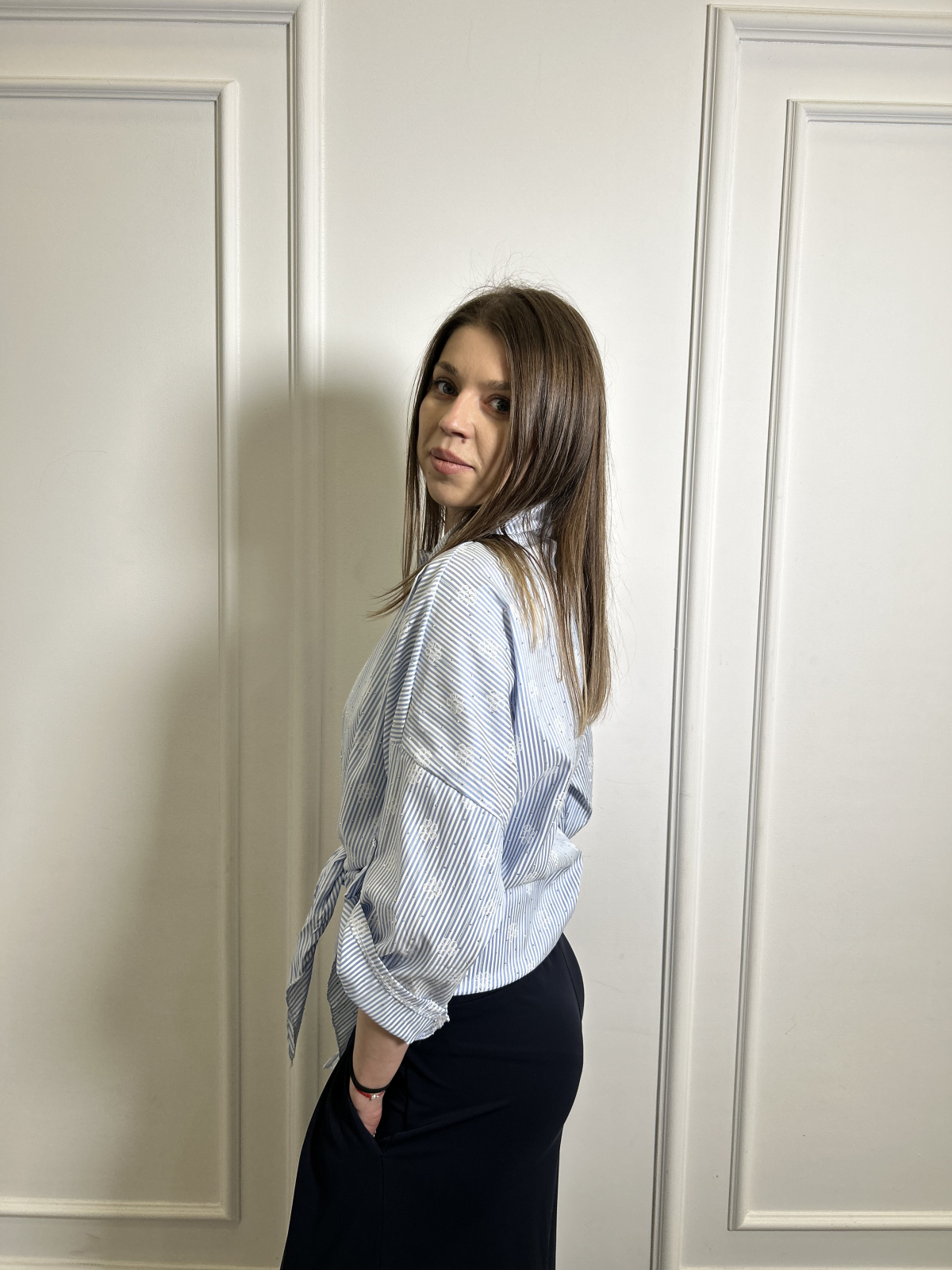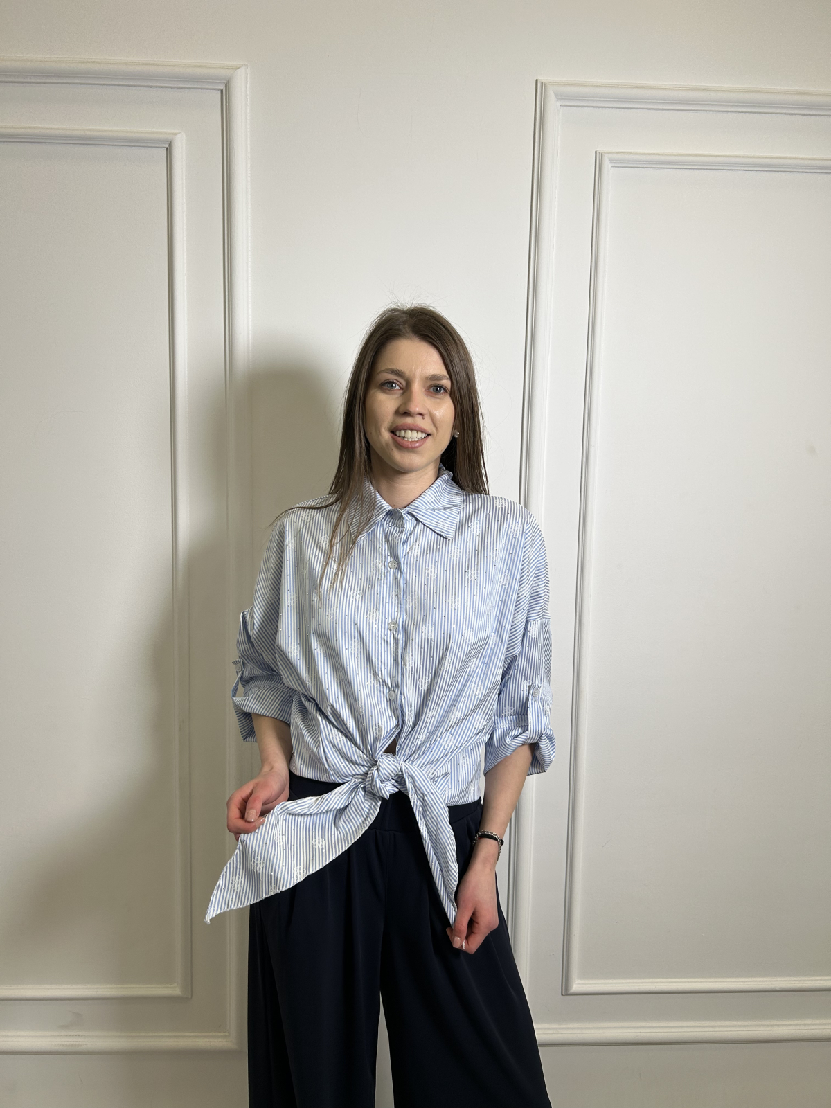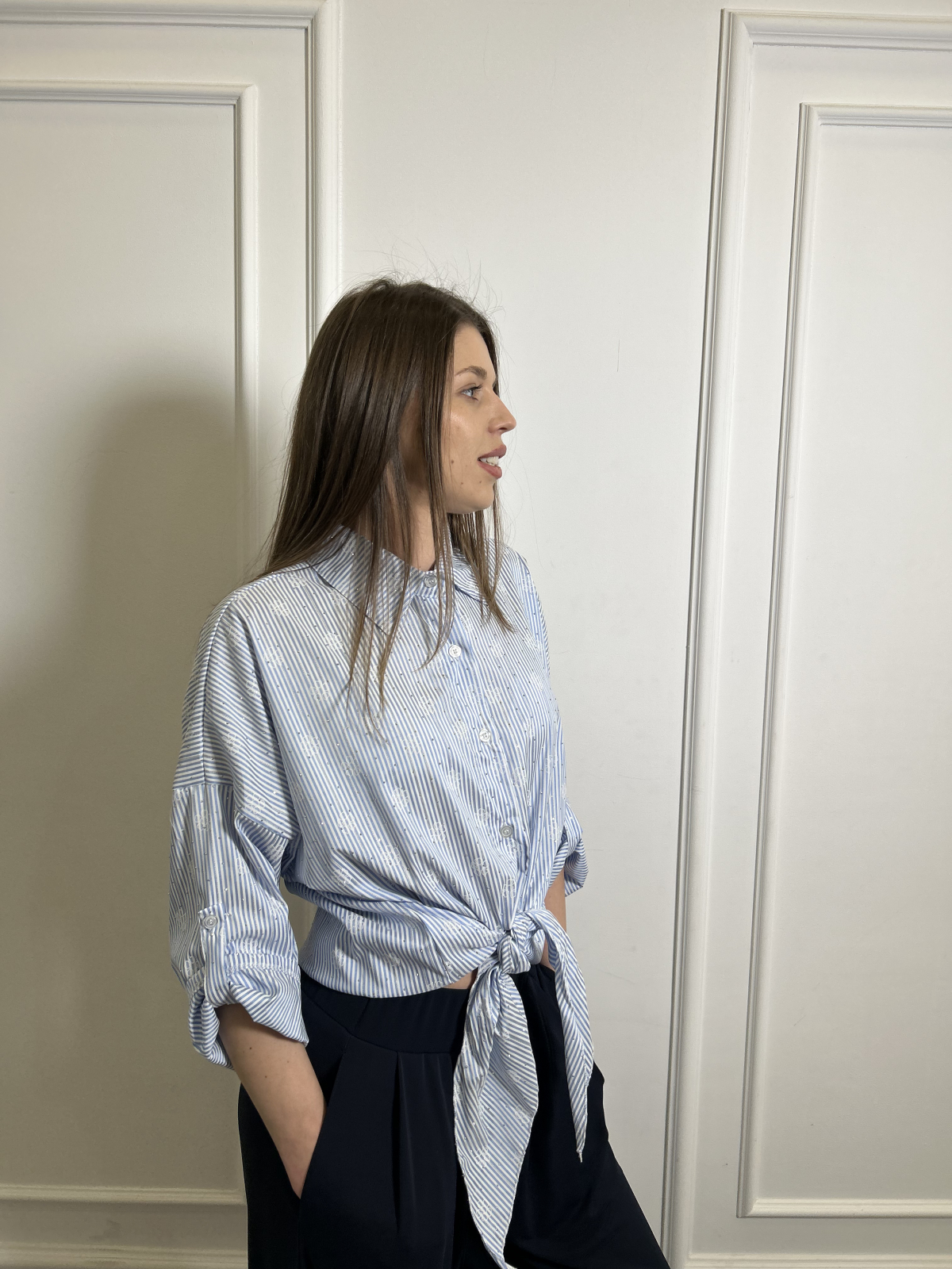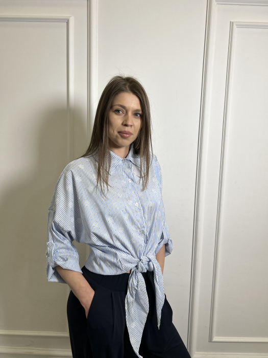 Camasa dama albastra cu strasuri si floricele pictate