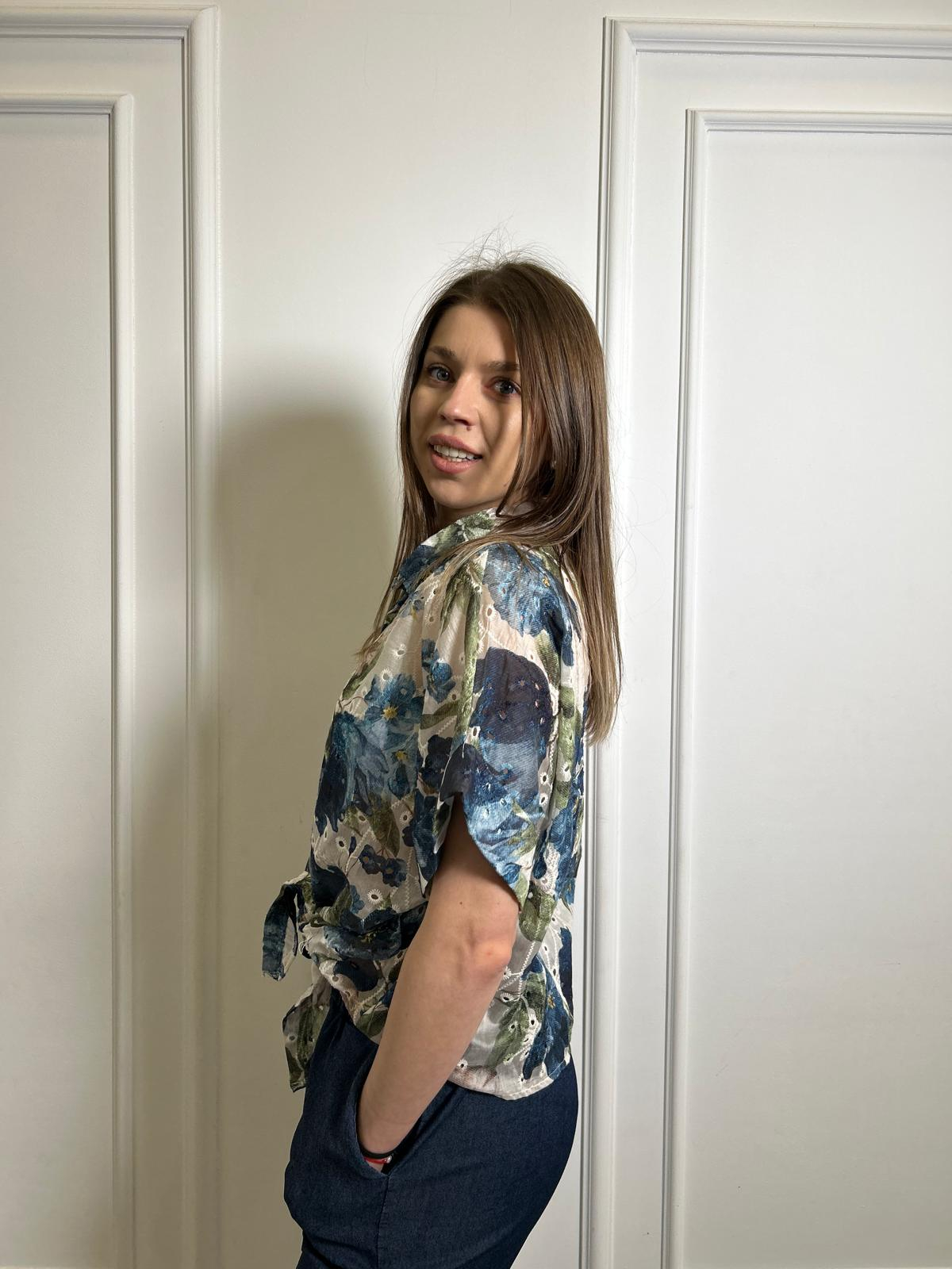 Camasa dama bej perforata cu imprimeu floral albastru