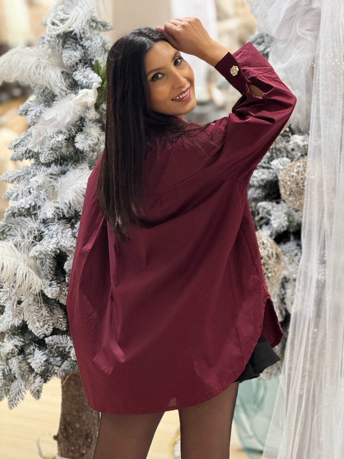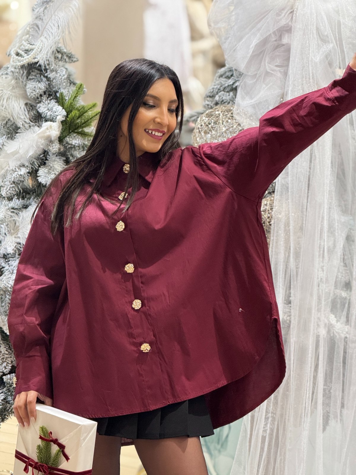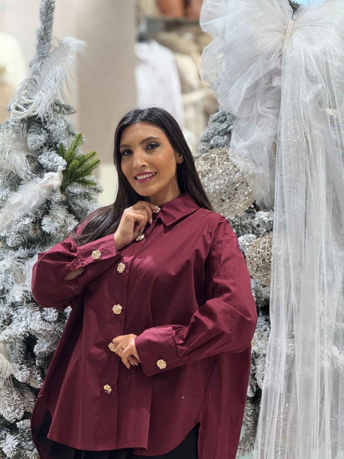 Culoarea bordo este sinonimă cu rafinamentul și eleganța atemporală. Este acea nuanță care spune multe, fără să ridice vocea – o prezență discretă, dar memorabilă. Această cămașă bordo, decorată cu nasturi aurii supradimensionați, este o piesă care vorbește despre stilul matur, conștient, care știe că frumusețea stă în detalii.