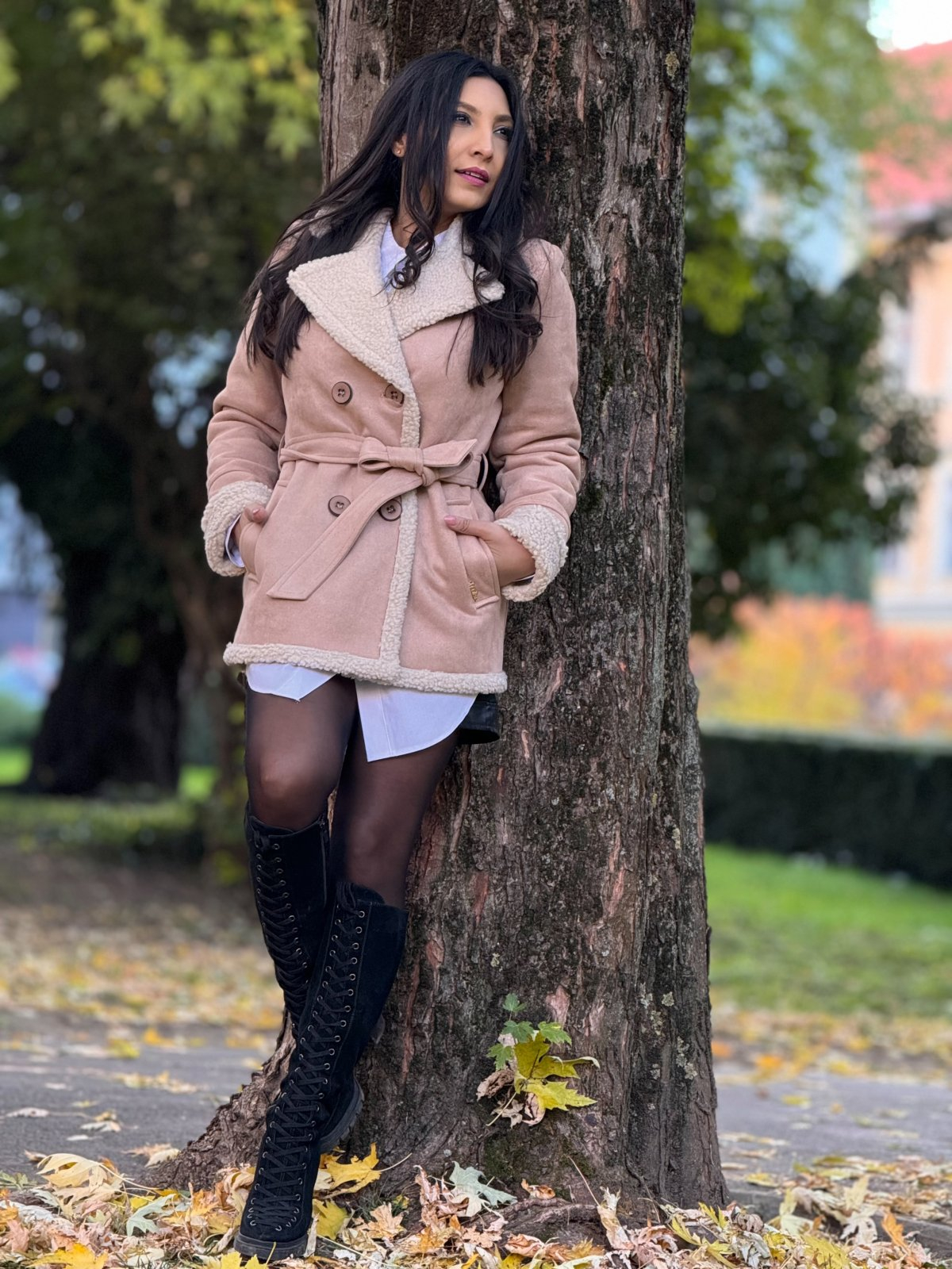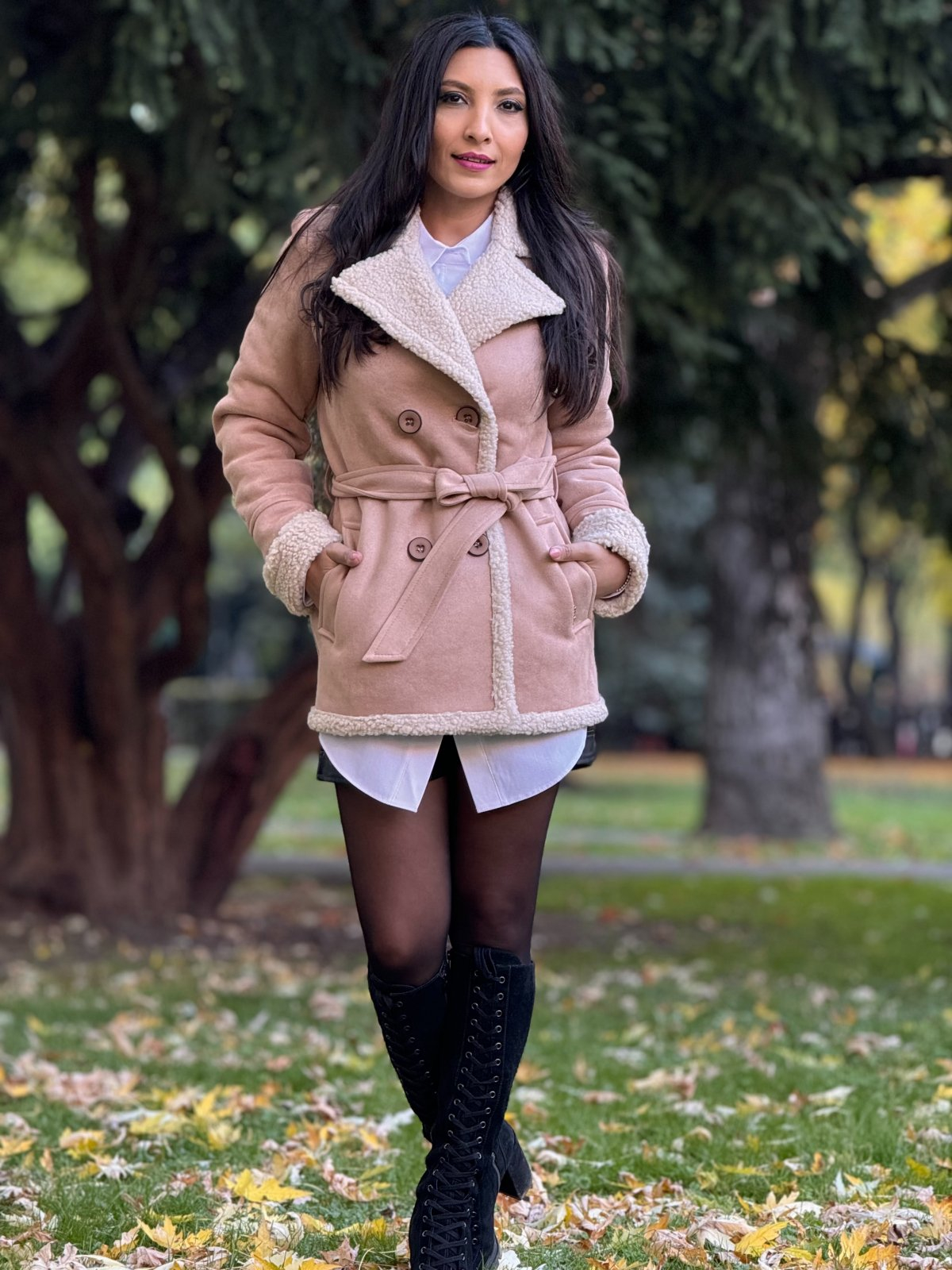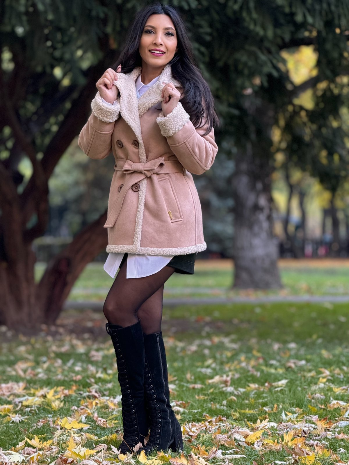 Toamna are un farmec aparte – aer răcoros, miros de frunze uscate și dorința de confort. Cojocul acesta scurt, cu buzunare mari și cordon în talie, este exact acea piesă care îmbină eleganța cu căldura. Bejul său cald se potrivește perfect cu nuanțele sezonului și oferă un look sofisticat, dar relaxat.