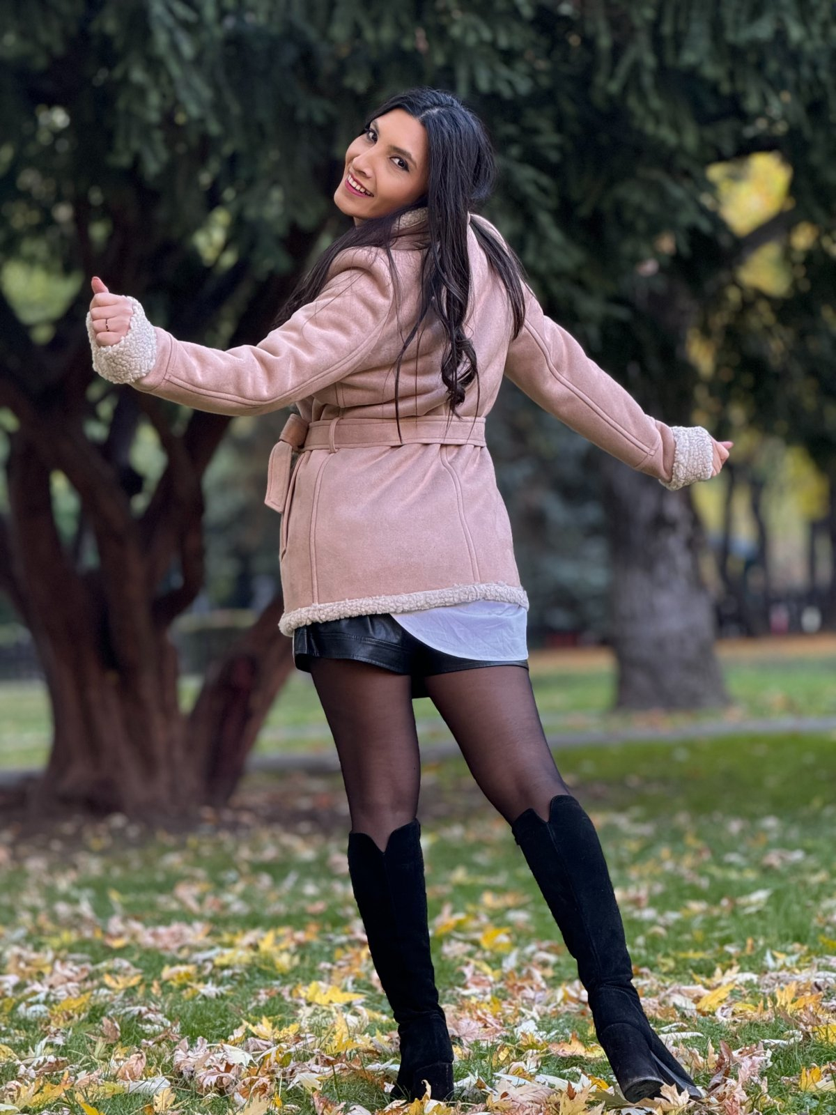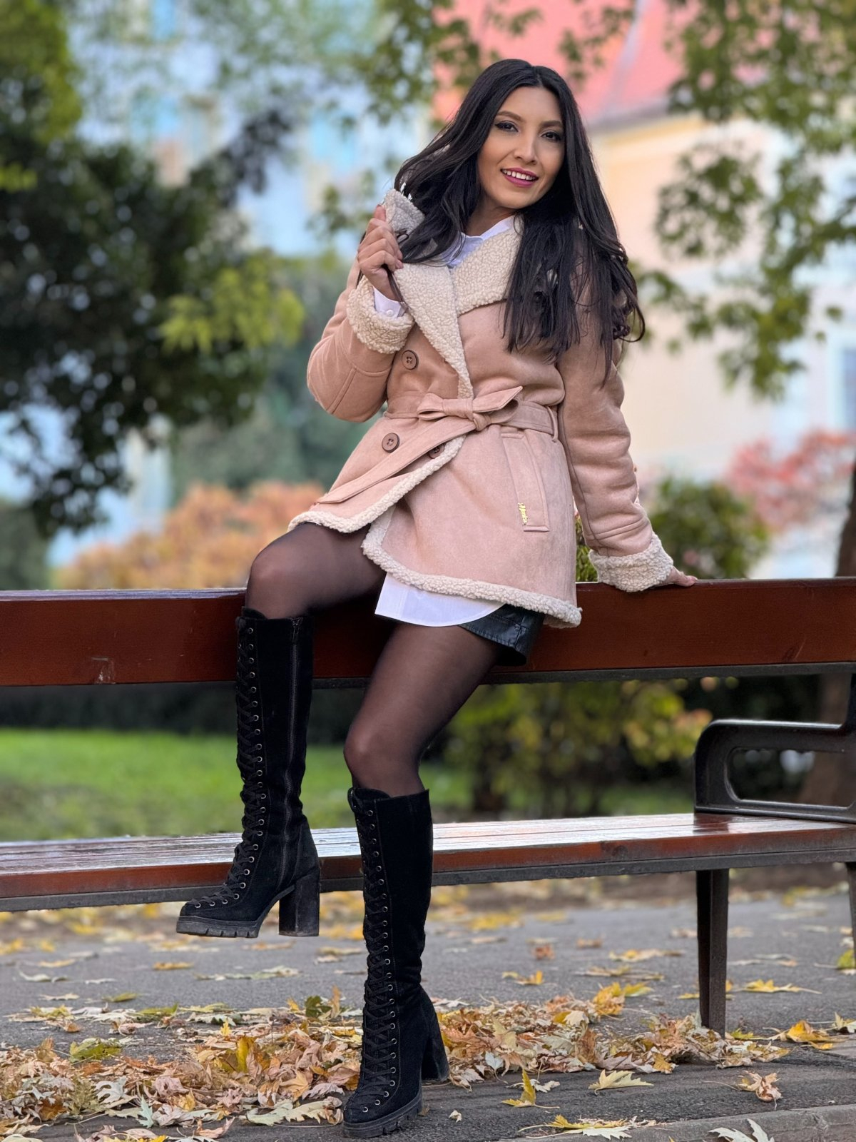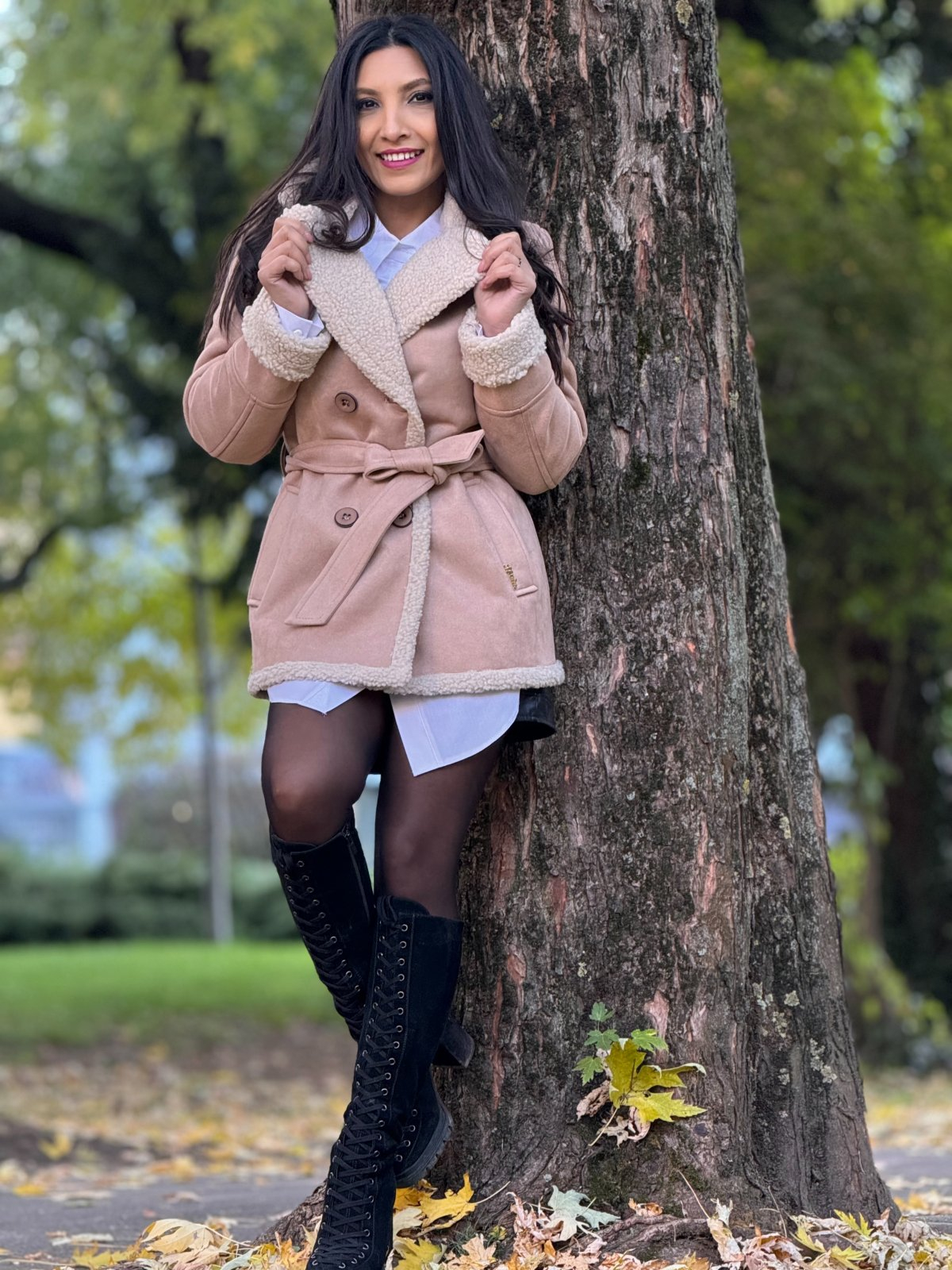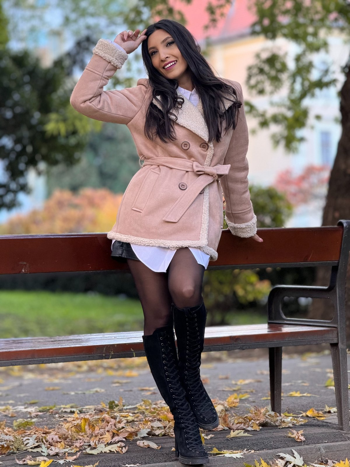 Toamna are un farmec aparte – aer răcoros, miros de frunze uscate și dorința de confort. Cojocul acesta scurt, cu buzunare mari și cordon în talie, este exact acea piesă care îmbină eleganța cu căldura. Bejul său cald se potrivește perfect cu nuanțele sezonului și oferă un look sofisticat, dar relaxat.